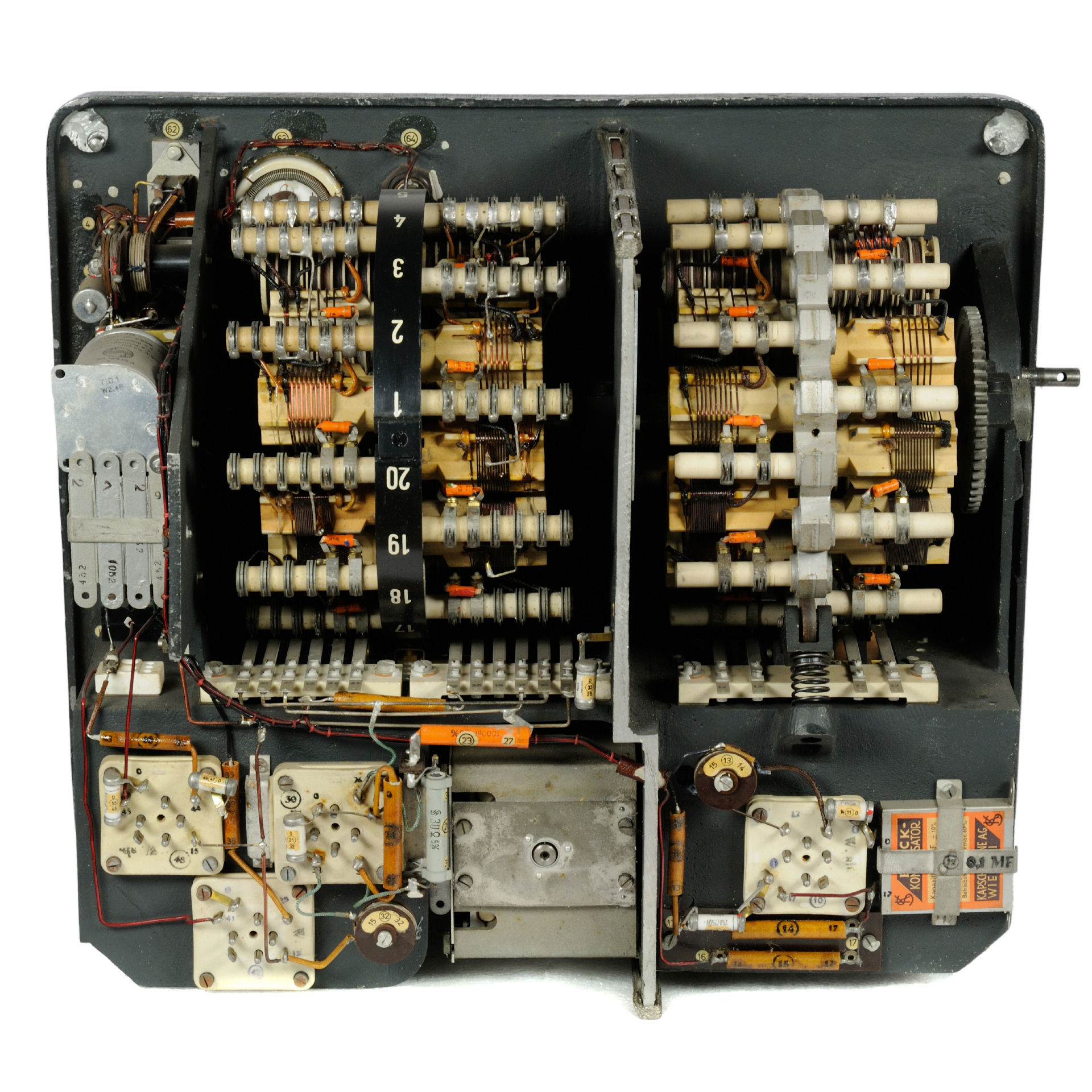 | Material | Das Gehäuse und die tragenden Teile sind aus Leichtmetallguß, als Spulenträger werden Calitkörper und -stäbe verwendet. Der Zweifach-Abstimmungskondensator ist eine Spezialkonstruktion mit kleinstem Temperaturgang. |