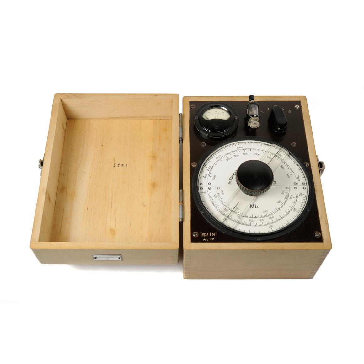 Das Gerät ist in einem verzapften Eichenholz-Kasten mit abnehmbarem Deckel eingebaut. Alle Instrumente und Bauteile sind auf einer 4 mm dicken Isolierplatte aus Pertinax befestigt. Der Frequenzmesser arbeitet nach dem Resonanzverfahren im Frequenzbereich von 150 kHz bis 60 MHz, unterteilt in 5 Bereichen. Zur Resonanzanzeige dient eine Diodenschaltung, zur Gleichrichtung wird ein Detektor verwendet, die Anzeige erfolgt über ein Drehspulinstrument. |
