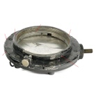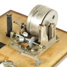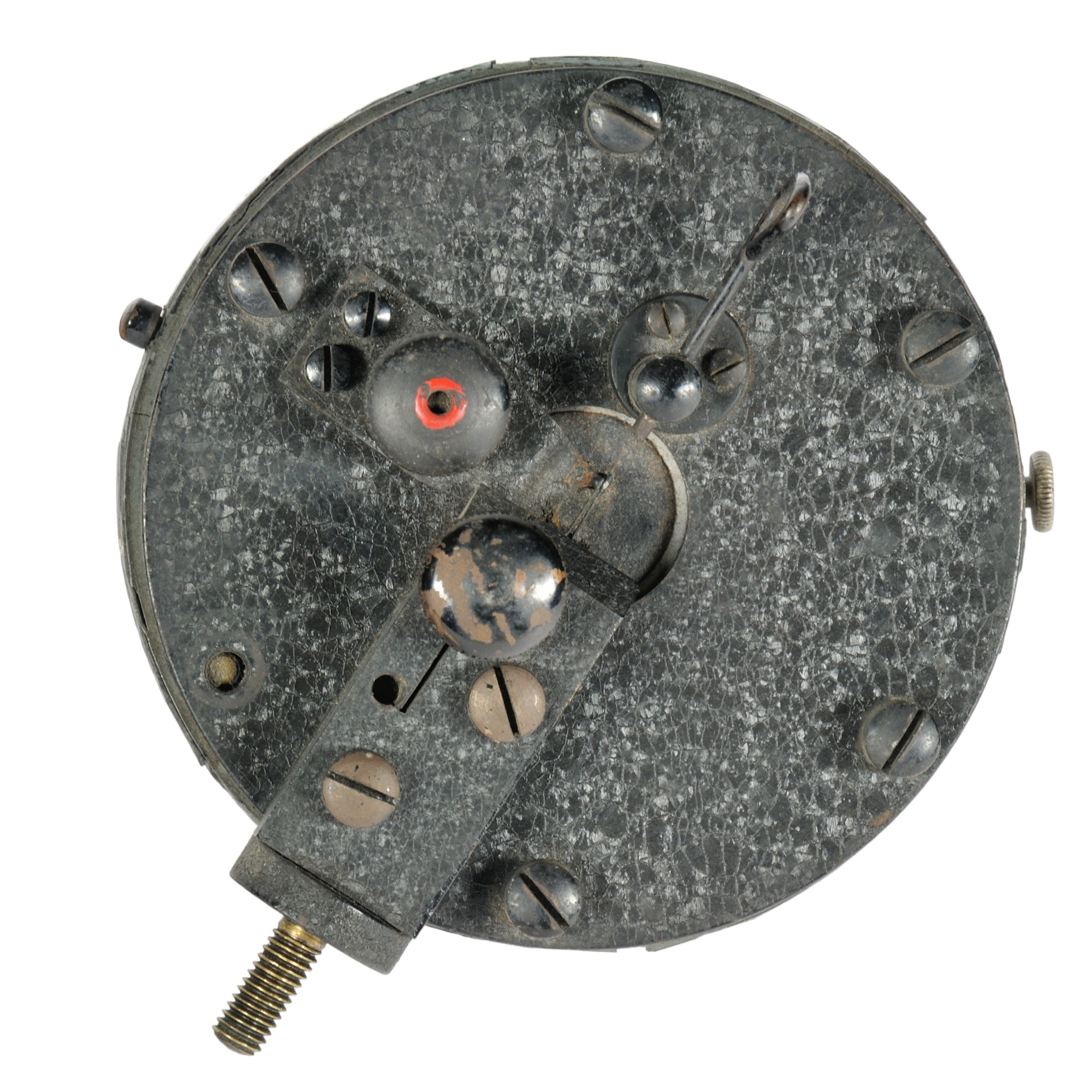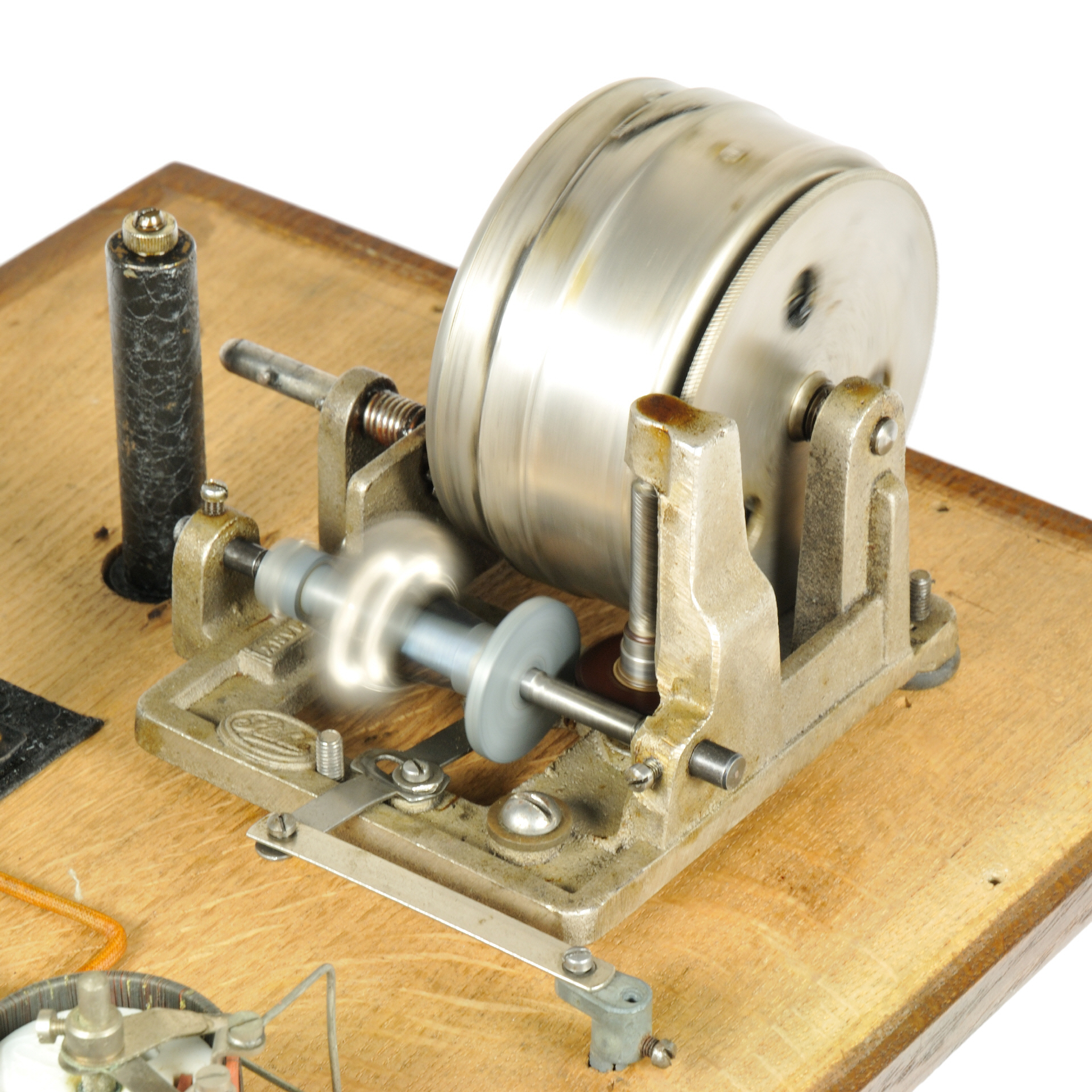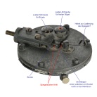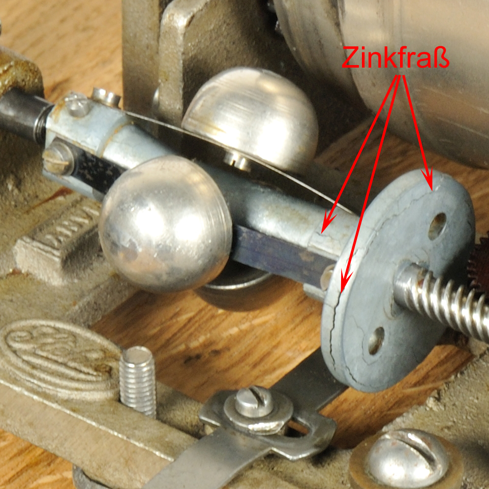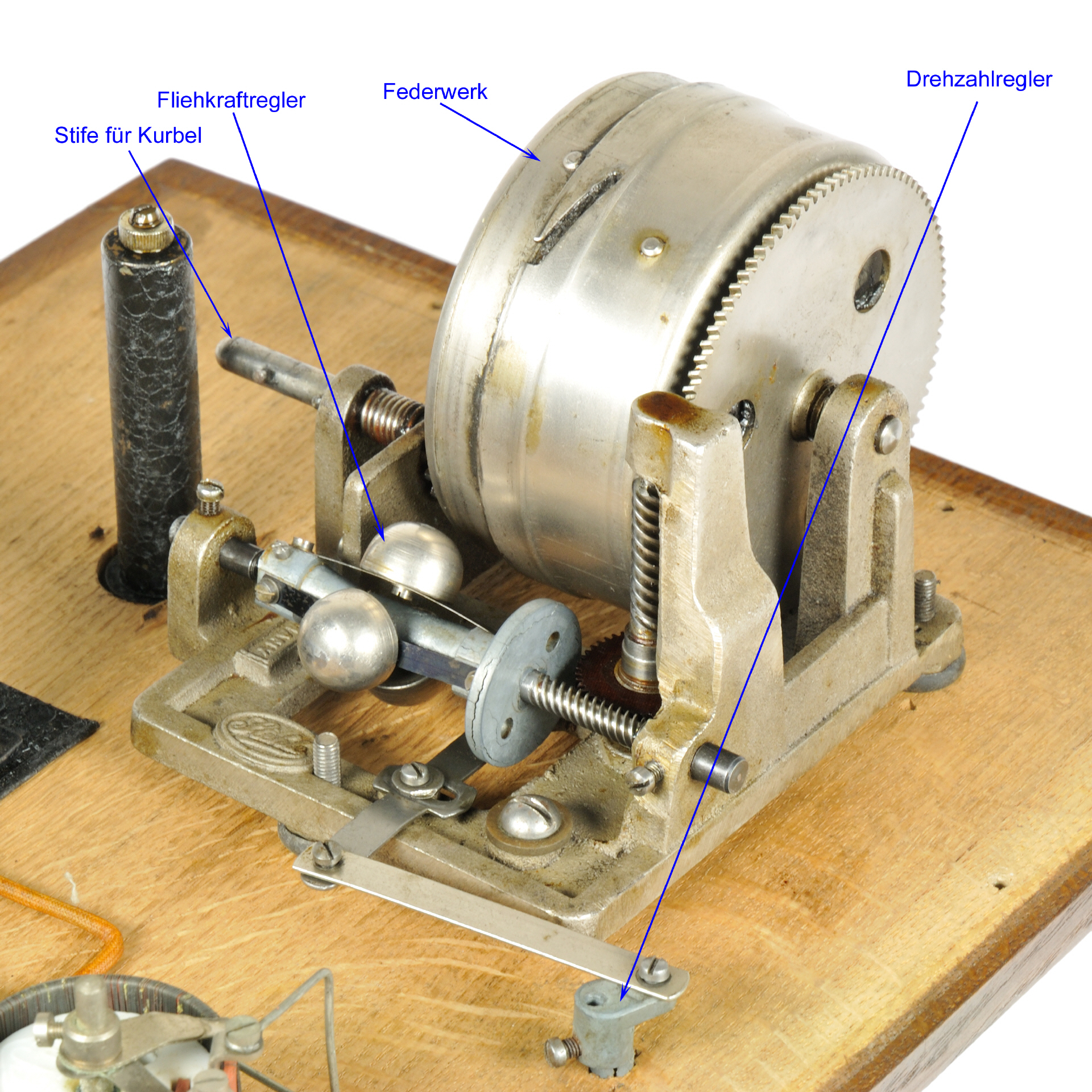 Antriebssystem: Das Antriebssystem, gefertigt von der Firma Stehle, besteht aus einem Federwerk mit Fliehkraftregler. Über diesen kann die Rotationsgeschwindigkeit des Drehspiegels eingestellt werden. Der Zinkfraß hat allerdings auch hier einige Teile befallen. |