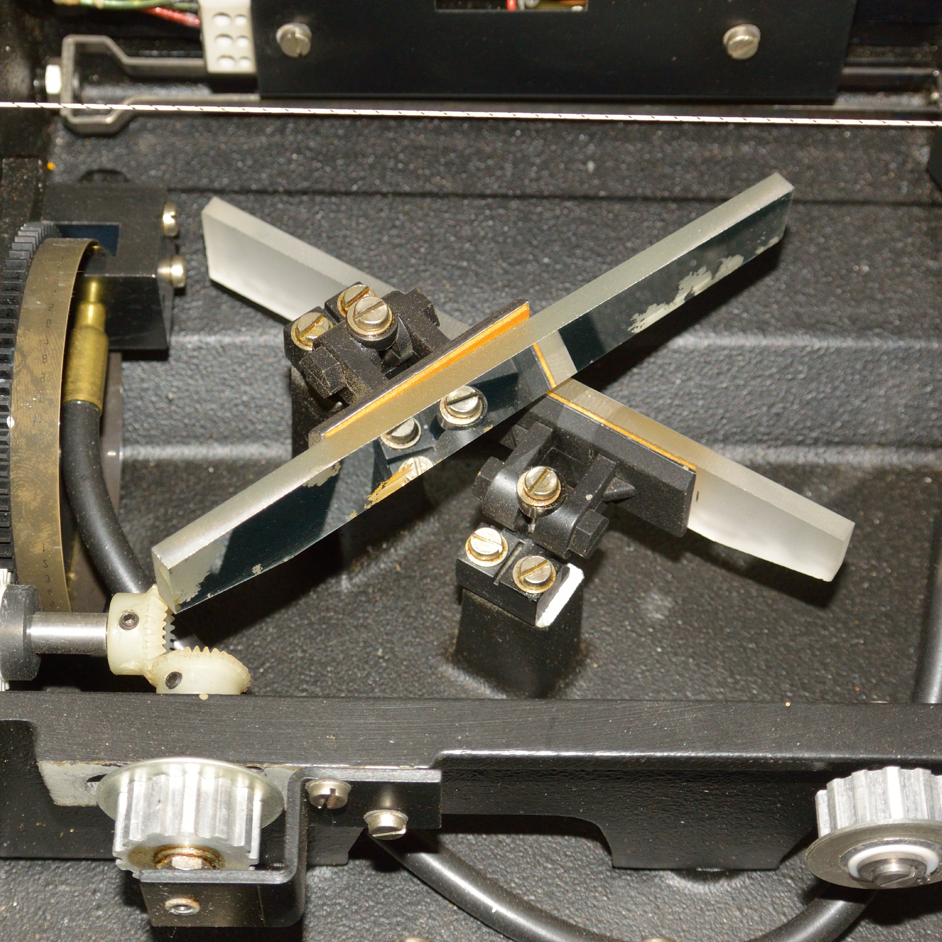 Der mechanische Aufbau des Gerätes basiert auf einem stabilen Chassis aus Leichtmetall, auf das alle Komponenten montiert sind. Deckel, Seitenwände und Boden können geöffnet werden, dadurch ist ein einfacher Zugang zu den elektrischen und mechanischen Bauteilen gewährleistet. Das Gerät ist für den Einbau in 19‘‘ Standard-Racks ausgelegt. Die wichtigsten Komponenten: Lichtquelle: Quecksilberdampf-Höchstdrucklampe Strahlengang: Zylinderoptik, Spiegelsystem Magnetsystem: Elektromagnet mit ca. 1 Tesla Feldstärke an den Polbohrungen Registriersystem: Spulenschwinger vom Typ HMK Antrieb: Synchron-Motor mit Außenläufer Netzteil: eingebaut, für standardmäßig 220V / 50 Hz Weitere Funktionen: Intensitätsregulierung Registriergeschwindigkeit bis 2000 m/s Papiervorschub bis 1000 mm/s Papierstandsanzeige Zeitmarken |