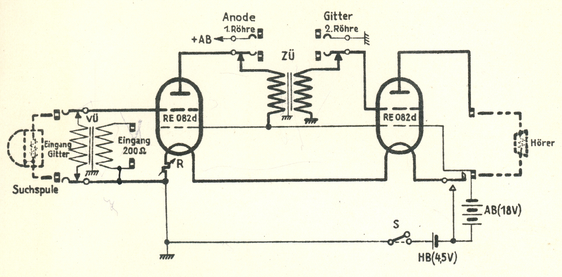 Der Heizstromkreis der Verstärkerröhren ist außer über den Schalter S noch über einen Arbeitskontakt der Hörerdoppelbuchsen geführt. Zur Einschaltung des Heizkreises muss also der Schalter S ein- und der Hörer angeschaltet werden. Diese Schaltung ist gewählt worden, damit der Heizkreis ausgeschaltet ist, falls beim Abschluss einer Messung und Einpacken des Gerätes der Schalter versehentlich nicht ausgeschaltet wird. Der Heizstrom ist fest eingestellt (1936: ist mit dem Widerstand R stetig zur Einstellung der benötigten Lautstärke regelbar). Die durch die hohe Verstärkung (etwa 4 N bei 800 Hz) bedingte Pfeifneigung des Verstärkers wird durch die Verbindung des Bügels der Suchspule mit dem negativen Pol der Heizbatterien unterdrückt, weil beim Anfassen des Bügels das ganze Gerät geerdet wird.