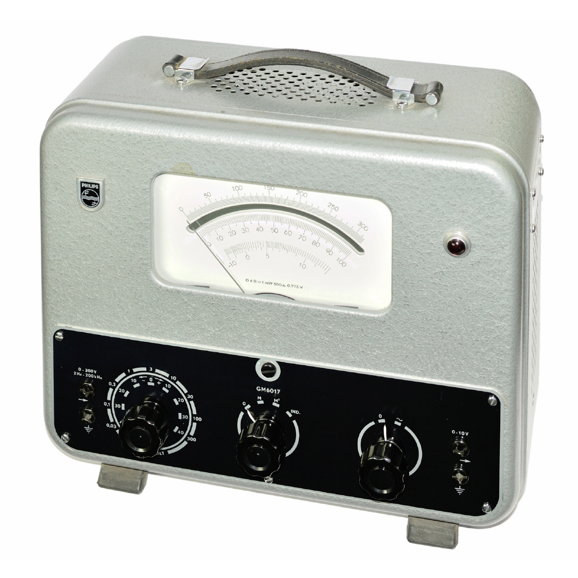 Das Philips Verstärker-Voltmeter GM 6017 ist für Wechselspannung von 1 mV bis 300 V bei einem Frequenzbereich von 2 Hz bis 200 kHz ausgelegt. Neben normalen Messungen in diesem Frequenzbereich können mit Hilfe eines geeigneten Sensors auch mechanische Schwingungen gemessen werden. Das Gerät besteht aus einem zweiteiligen Stahlblechgehäuse, das außen mit einem Hammerschlaglack (Effektlack) gestaltet ist. Oben befindet sich ein Tragegriff, auf der Unterseite zwei Standfüße (Gummi). Die Bedienelemente (vorne) und deren Beschriftung sind auf einer eloxierten Aluminiumplatte angebracht. Das Messwerk findet sich mittig hinter einer Glasplatte. Das Messwerk ist vollständig gekapselt von hinten auf der Frontplatte befestigt und durch Gummi abgedichtet. Alle elektronischen Bauteile und Röhren sind auf einem Baugruppenträger aus Blech befestigt, der von hinten auf der Frontplatte befestigt ist. Die Verbindungen zwischen den Bauteilen sind durch freie Verdrahtung realisiert. Im Gegensatz zu den Geräten GM 6005 und GM 6015 wird keine Grundplatte aus Pertinax verwendet, das Gerät ist dadurch robuster und leichter zu reinigen. Durch Abnehmen der Rückwand können alle Röhren direkt erreicht werden, auch alle anderen Bauteile sind erreichbar, das Messwerk muss nicht ausgelötet werden. |