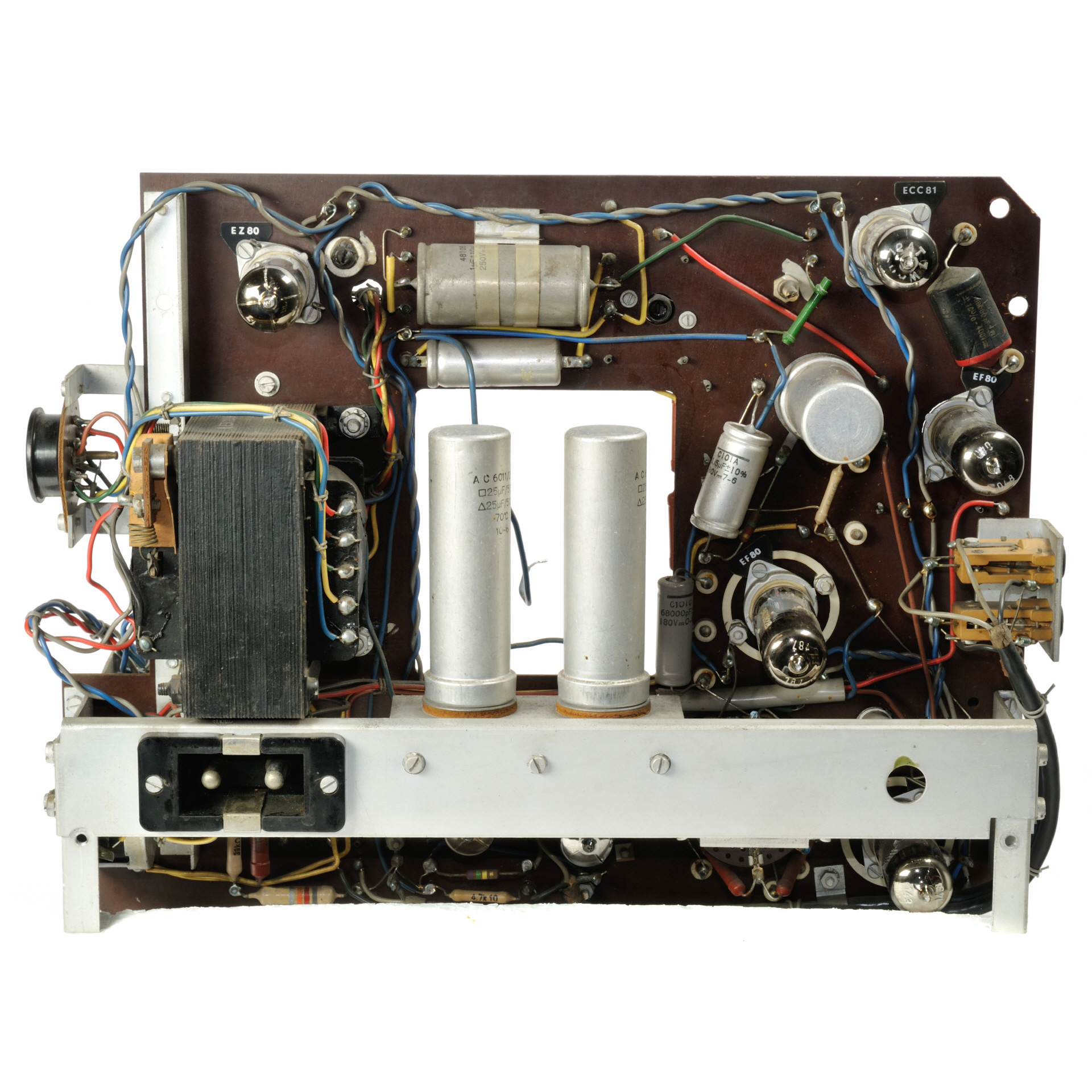 Röhren: 3 x EF80, ECC81, EB91, EZ80, 85A2 (alle Röhrensockel sind beschriftet) weitere Halbleiter: 4 x OA70 |