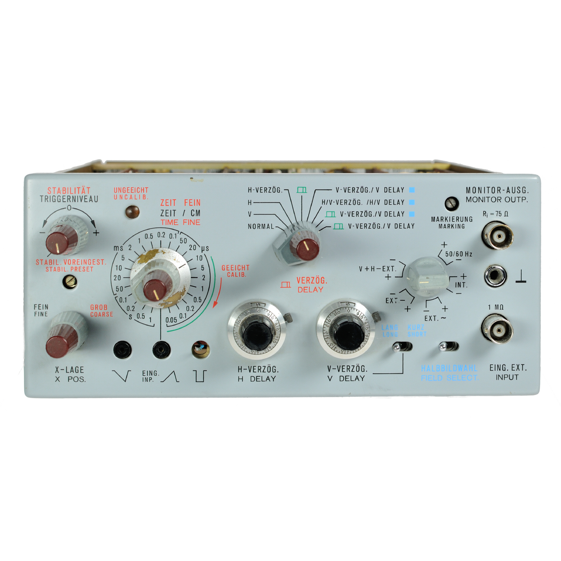 Zeiteinschub BN 191514. Erweiterung der vorgenannten Eigenschaften durch Kippverzögerung, gesteuert über V- und H-Impulse, mit deren Hilfe auch beliebige Ausschnitte mit maximaler Zeitauflösung innerhalb einer Zeile eines Fernsehbildes dargestellt werden können. Zur Auswertung von Prüfzeilen ist für die Kippverzögerung, ausgelöst durch V-Impulse, ein spezieller Verzögerungsbereich vorgesehen. Überschreibungen durch Doppelauslösung innerhalb einer oder zweier Zeilen ermöglichen ein optimales Messen von Impuls-Sprung-Signalen. Zusätzlich ist auch eine Überschreibung der Prüfzeilen eines Halbbildes mit den korrespondierenden Prüfzeilen des anderen Halbbildes mit getrennt einstellbaren Verzögerungszeiten vorgesehen. Automatische Voreinstellung von Trigger-Niveau und Stabilität erleichtern die Bedienung.