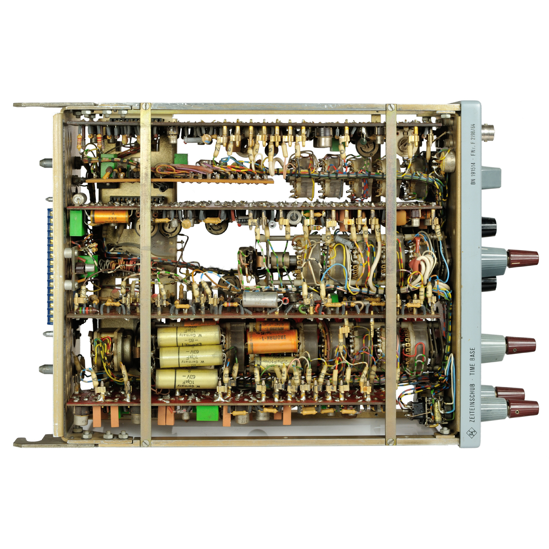 Der Zeiteinschub BN 191513 besitzt neben den normalen Zeitfolgen mit Auswahl der Synchronarten Normal, V und H Spezialeinstellungen für die Auflösung nach Bild und Zeile mit voreingestellten Zeiten und gekoppelter Synchronwahl. Eigen- und Fremdsynchronisierung, bei Fernsehsignalen mit Aufspaltung in Bild- und Zeilenimpulse oder mit getrennt zugeführten Bild- und Zeilenimpulsen, ist vorgesehen. Zusätzlich lupenähnliche Dehnung des Zeitmaßstabes X10 und X20.