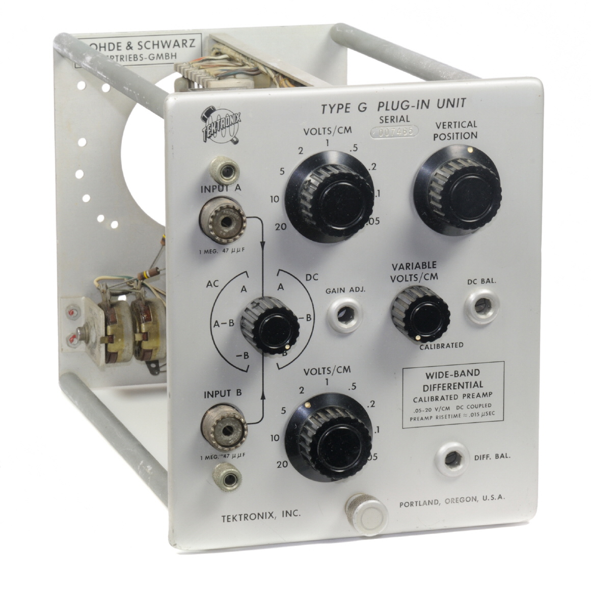 Der Typ G ist ein Breitband-Verstärker-Einschub mit Gleichspannungskopplung und Differenzeingang für Oszillografen der Tektronix 500 Serie. |