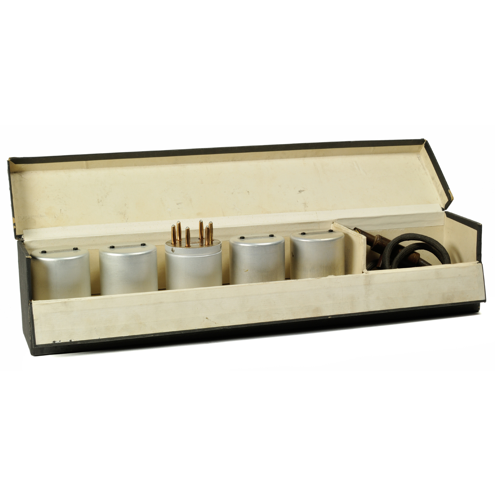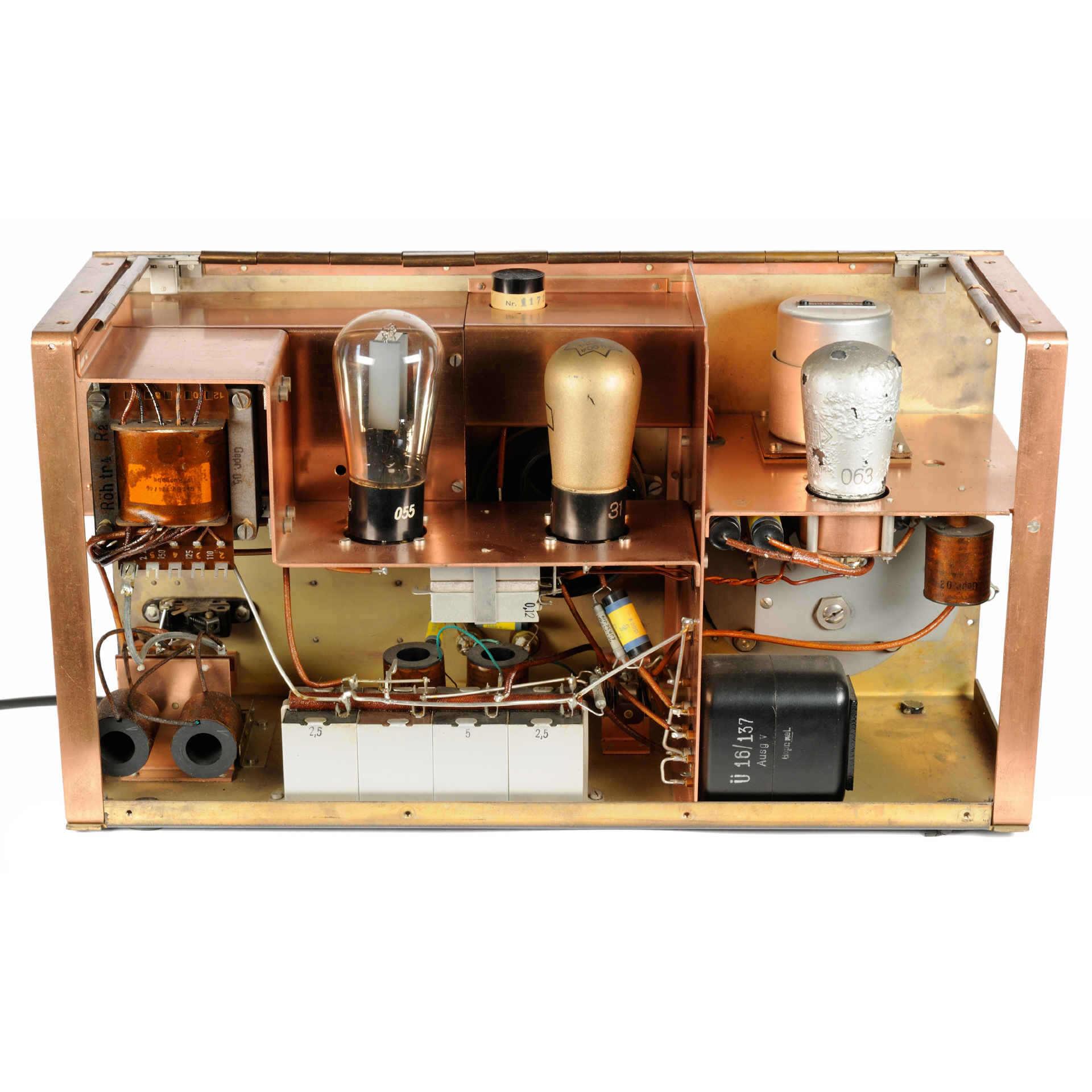 Der innere Aufbau des Chassis besteht vollständig aus Kupfer und Messing. Über eine Deckelklappe kann die Spule zur Auswahl des Frequenzbereichs getauscht werden, zudem sind die Röhren direkt im Zugriff, ohne dazu das Gehäuse aufschrauben zu müssen. Zum Gerät gehört ein Spulensatz aus 6 Spulen, die in einem mit der selben Seriennummer beschrifteten Kästchen aus bespanntem Karton befinden. Über diese Spulen wird der Frequenzbereich des Geräts gewählt. |