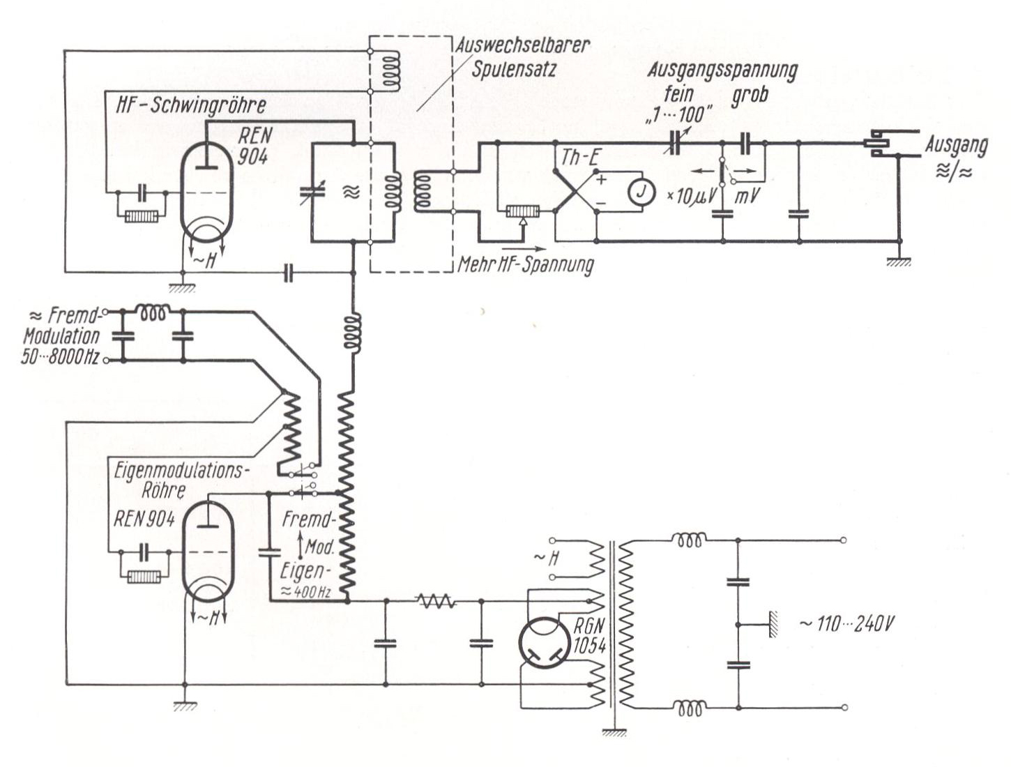 Als Hochfrequenzgenerator dient ein induktiv rückgekoppelter Röhrensender; die Modulationsfrequenz wird ebenfalls durch einen solchen Röhrengenerator erzeugt. Zur Modulation wird die Tonfrequenzspannung der Anodengleichspannung des Senders überlagert. Die gewünschte Ausgangsspannung kann an einem geeichten Spannungsteiler unmittelbar eingestellt und abgelesen werden. Der Scheinwiderstand des Ausgangs entspricht dem einer normalen Empfangsantenne. Als Anzeigegerät am Ausgang des Rundfunkempfängers dient ein Tonfrequenz- Strom- und Spannungsprüfer Rel mse 48 a oder ein entsprechendes anderes Gerät.
