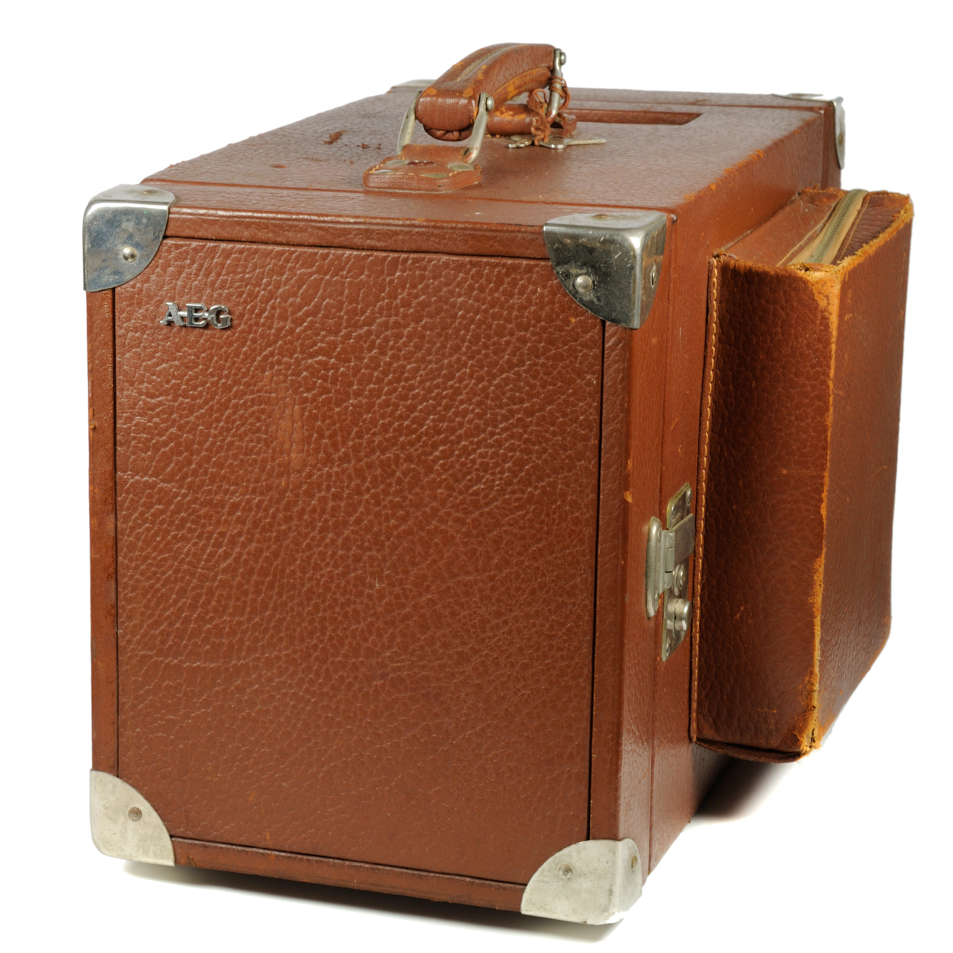 Firmenschild "AEG" auf der Frontseite; Auf der Innenseite der hinteren Klappe des Lederkoffers findet sich ein Prinzipschaltbild zur Anschaltung des Schreibers inklusive des Vorwiderstandes. |