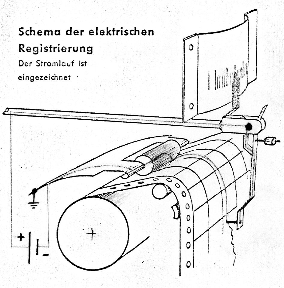 Bei der Aufzeichnung fließt von einer Schreibspannungsquelle (18 bis 24 V-) ein Strom über den Messwerkarm und die Elektrode zum Metallpapier. Von dem Papier wird der Strom durch eine großflächige Kohlerolle abgenommen, die ihrerseits wieder mit der Schreibspannungsquelle verbunden ist. Der Lichtbogen zwischen Elektrode und Metallbelag verbrennt letzteren. Dadurch entsteht eine gut sichtbare Markierung und, sobald der Streifen fortbewegt wird, eine exakte Schreibspur.