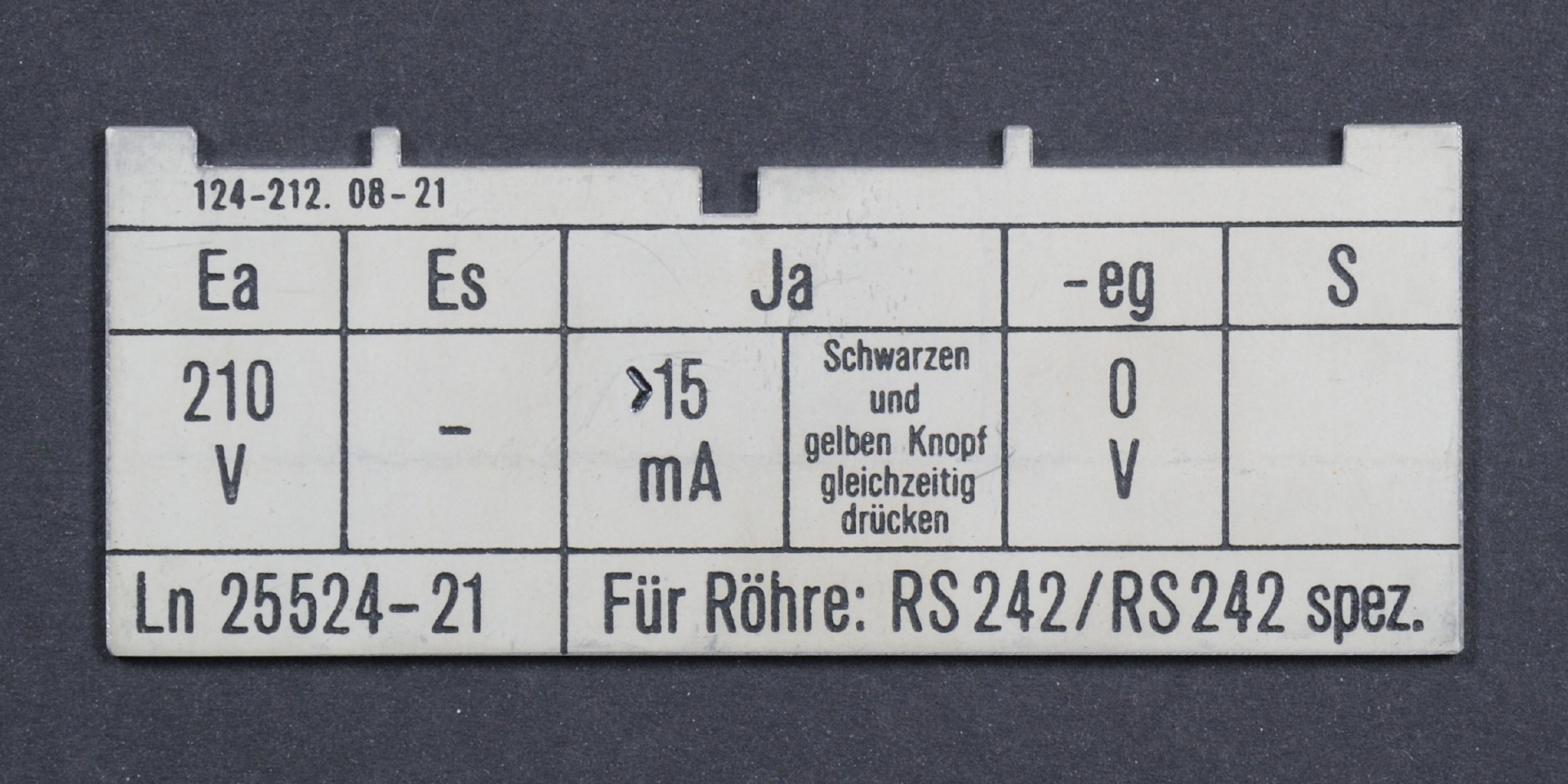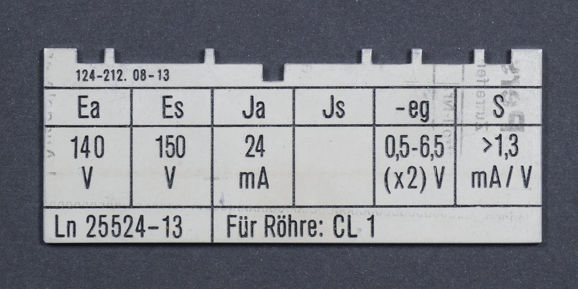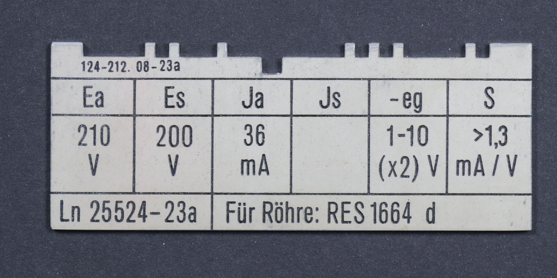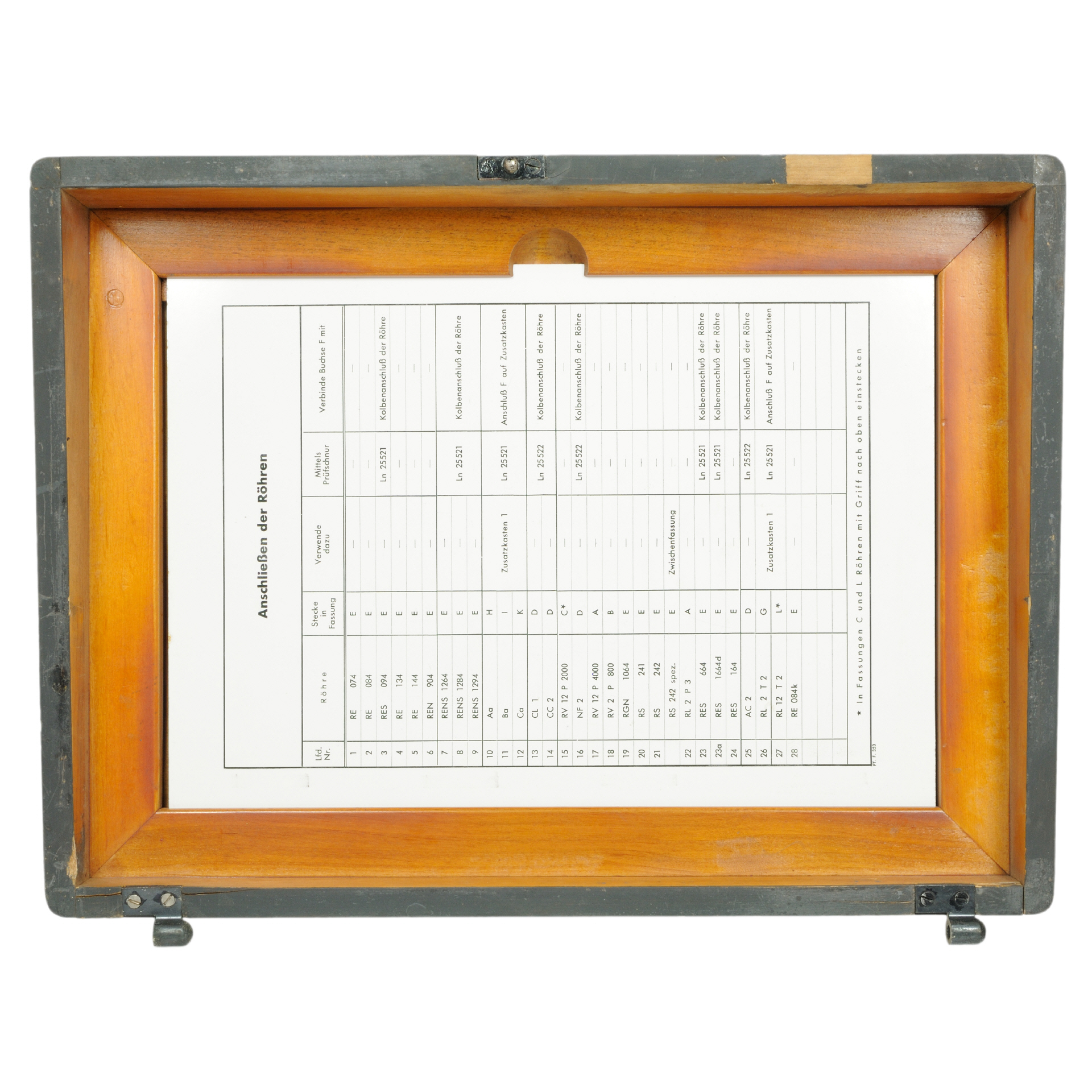 mit dem vorhandenen Schlüsselsatz prüfbare Röhren: RE074, RE084, RES094, RE134, RE144, REN904, RENS1264, RENS1284, RENS1294, CL1, CC2, RV12P2000, NF2, RV12P4000, RV2P800, RGN1064, RS241, RS242, RS242 spez., RL2P3, RES664, RES1664d mit Zusatzkasten 1 messbare Röhren (Zusatzkasten und Schlüssel nicht vorhanden): AA, BA, CA, RL2T2, RL12T2 Gesamtliste aller prüfbaren Röhren mit vollständigem Schlüsselsatz: RE074, RE084, RES094, RE134, RE144, REN904, RENS1264, RENS1284, RENS1294, AA, BA, CA, CL1, CC2, RV12P2000, NF2, RV12P4000, RV2P800, RGN1064, RS241, RS242, RS242 spez., RL2P3, RES664, RES1664d, RES164, AC2, RL2T2, RL12T2, RE084K |