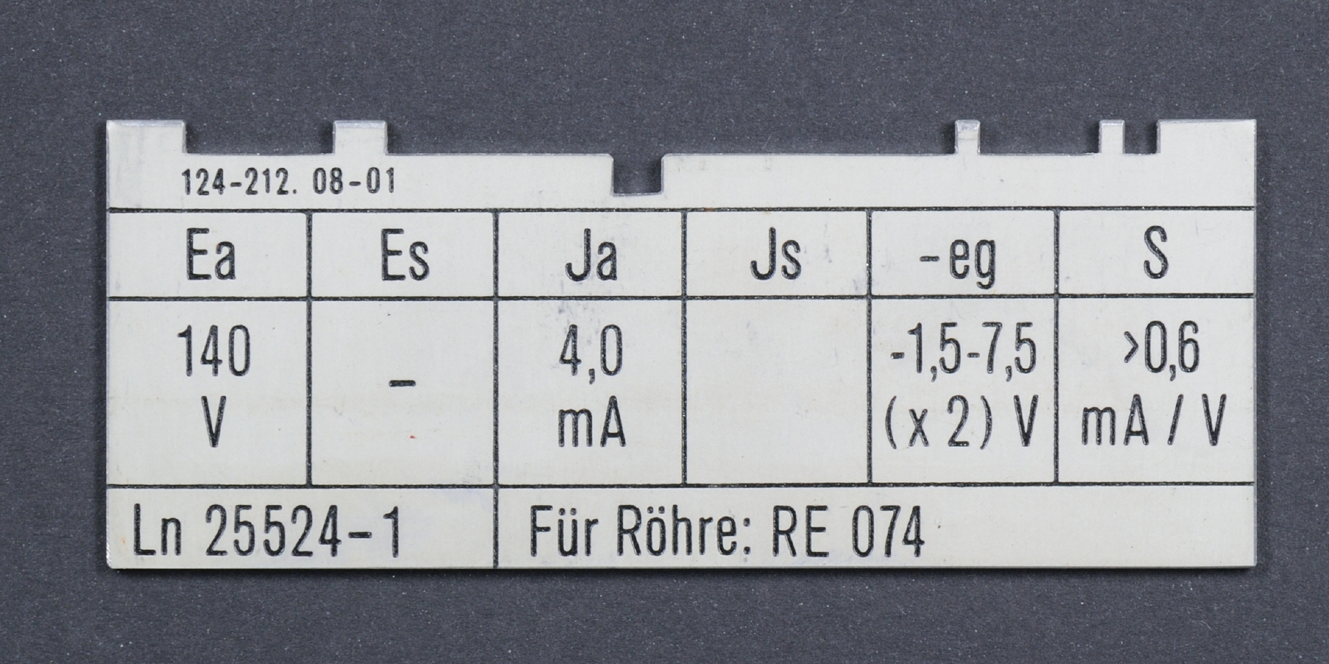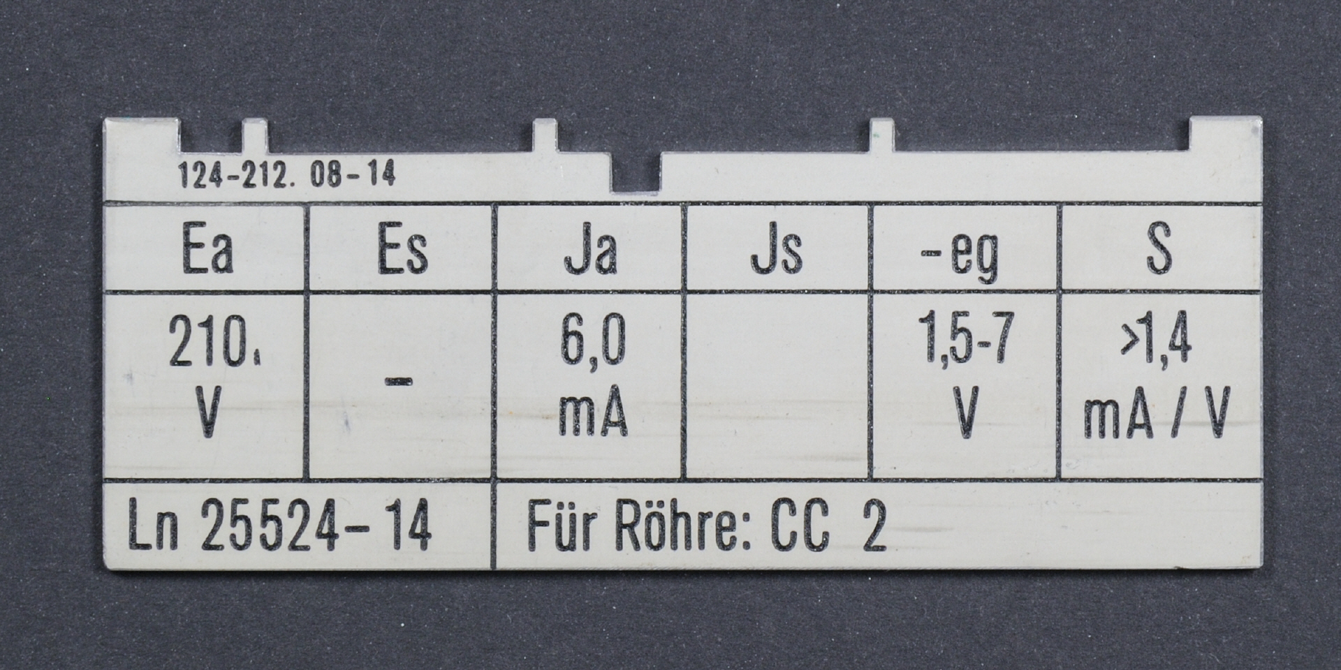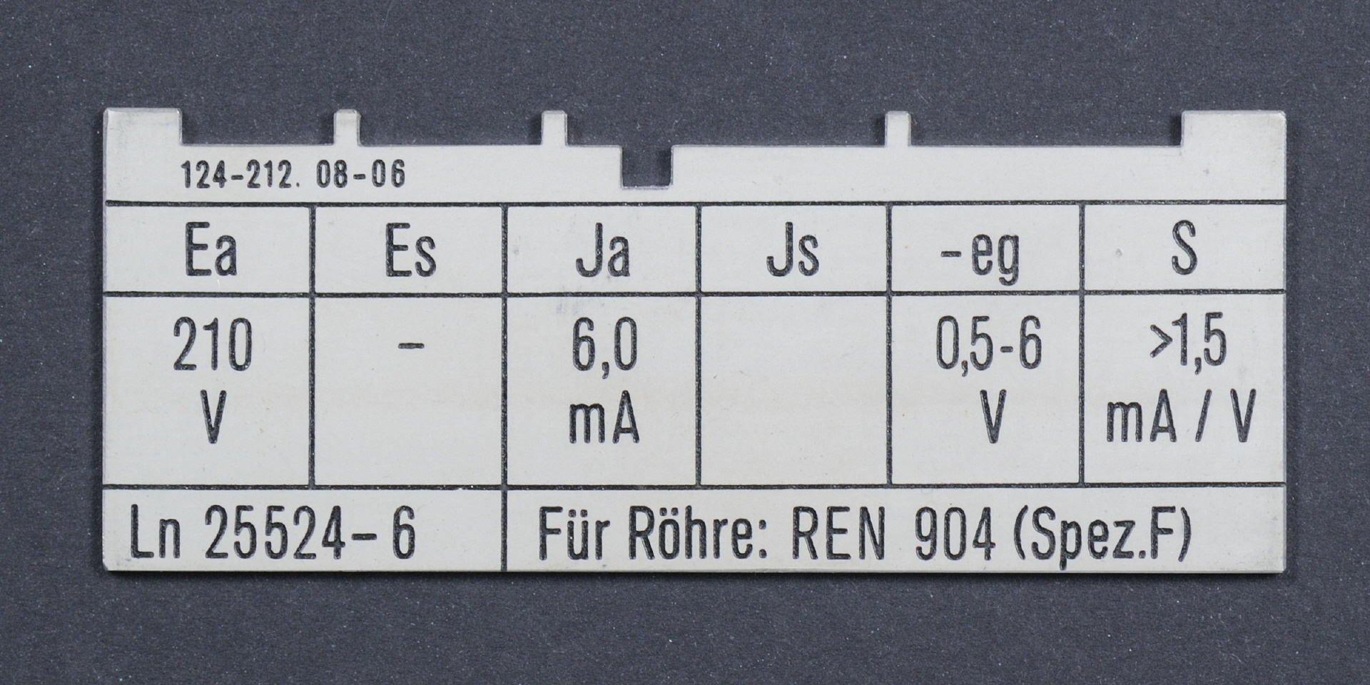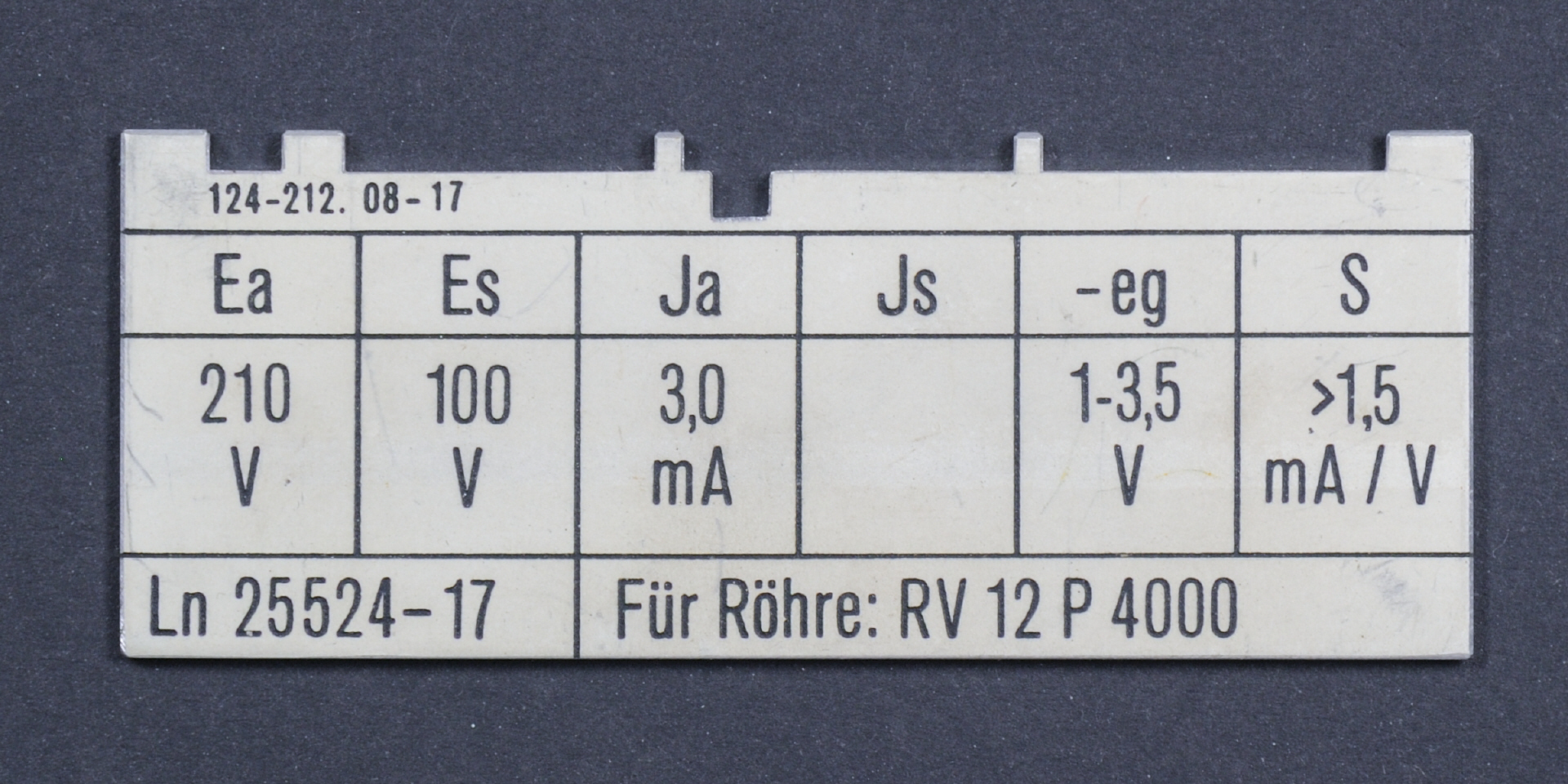 mit dem vorhandenen Schlüsselsatz prüfbare Röhren: RE074, RE084, RES094, RE134, RE144, REN904, RENS1264, RENS1284, RENS1294, CL1, CC2, RV12P2000, NF2, RV12P4000, RV2P800, RGN1064, RS241, RS242, RS242 spez., RL2P3, RES664, RES1664d mit Zusatzkasten 1 messbare Röhren (Zusatzkasten und Schlüssel nicht vorhanden): AA, BA, CA, RL2T2, RL12T2 Gesamtliste aller prüfbaren Röhren mit vollständigem Schlüsselsatz: RE074, RE084, RES094, RE134, RE144, REN904, RENS1264, RENS1284, RENS1294, AA, BA, CA, CL1, CC2, RV12P2000, NF2, RV12P4000, RV2P800, RGN1064, RS241, RS242, RS242 spez., RL2P3, RES664, RES1664d, RES164, AC2, RL2T2, RL12T2, RE084K |
