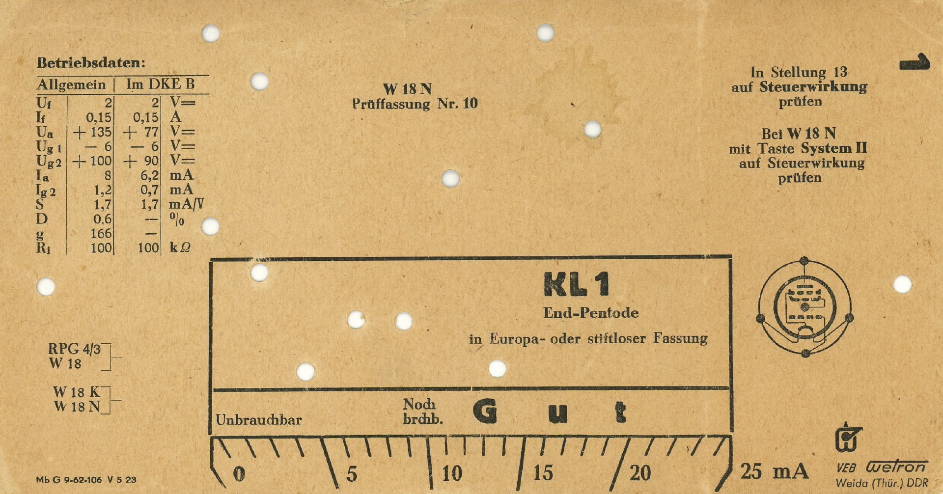 Die Prüfkarten haben eine Abmessung von ca. 200 x 105 mm und sind gelocht. Die Karten besitzen eine Skala, die die Skala des Messwerks nach oben "verlängert" und mit "Unbrauchbar", "Noch brauchbar" und "Gut" beschriftet ist. Neben der mit der Karte zu prüfenden Röhrentypen sind auch die Betriebsdaten aufgelistet. Alle Karten sind nummeriert. Karten / Kartensätze: Der Kartensatz entspricht weitgehend dem Kartensatz des Funke W18, die Karten sind aber nicht kompatibel. Fuke Prüfkarten können hier nicht verwendet werden! Auf Jogis Röhrenseiten findet sich ein Tabellenbuch Dem Exponat liegen ### Karten bei, höchste Nummer ist die Prüfkarte 1528 |