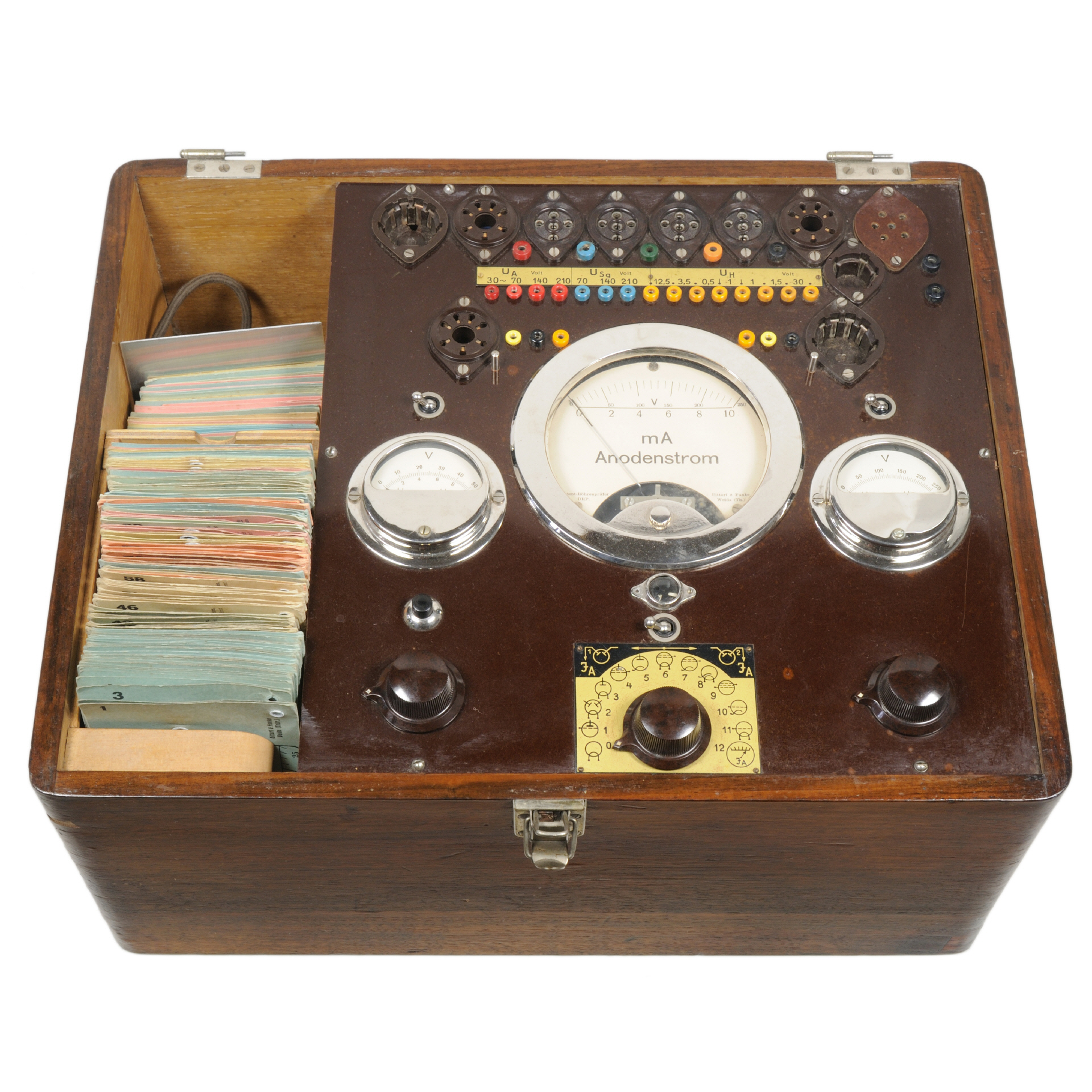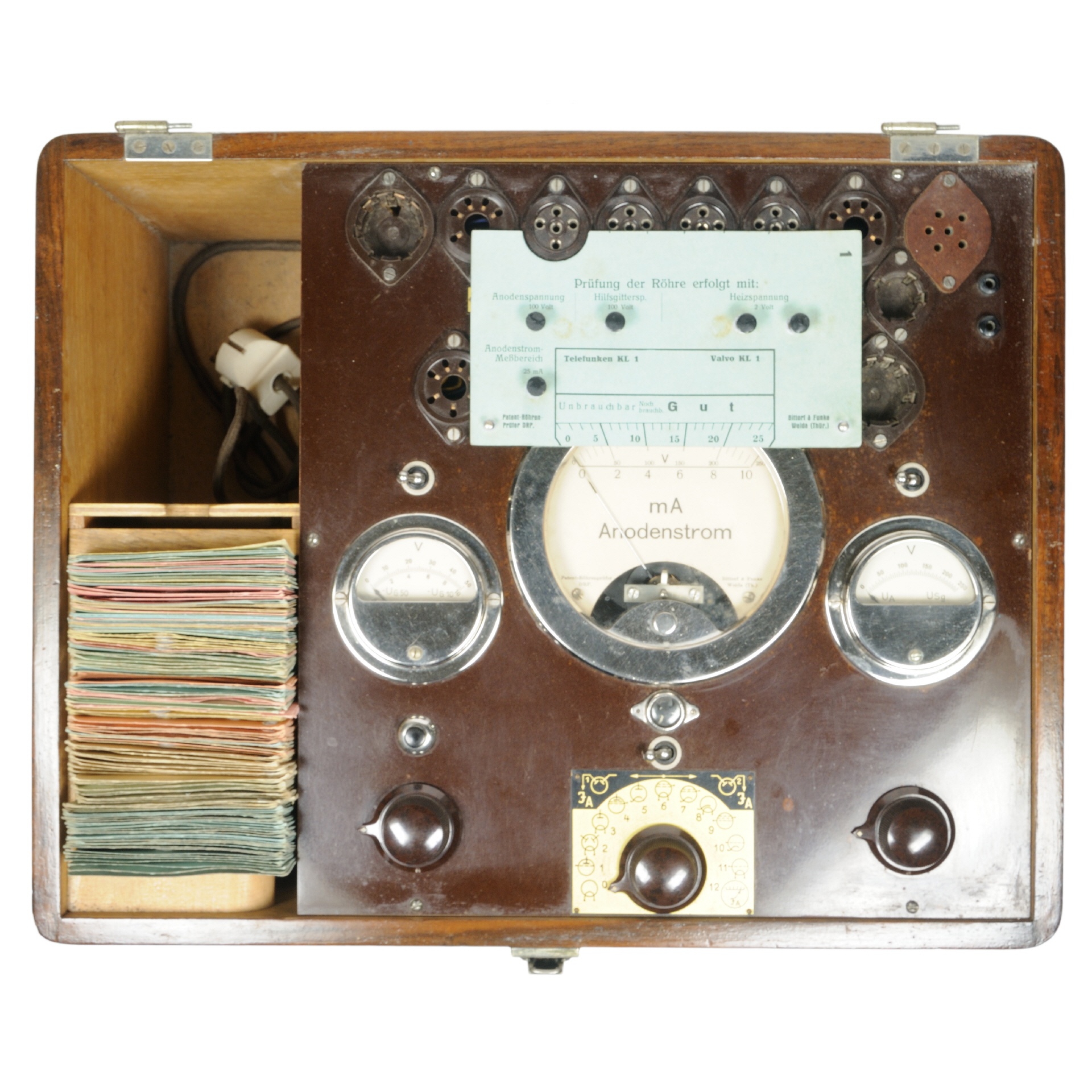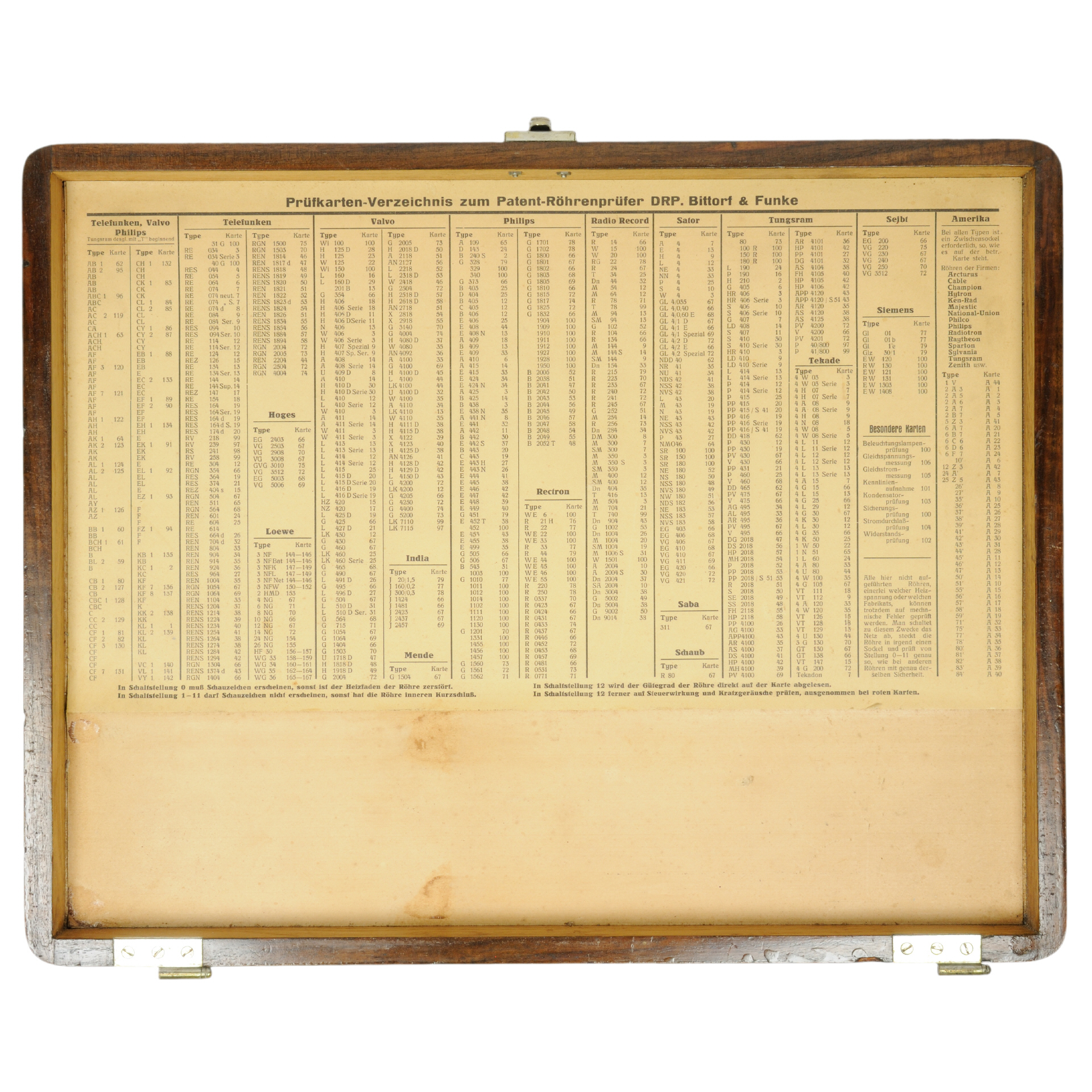 Die Prüfkarten haben eine Abmessung von ca. 180 x 100 mm, sind gelocht (Metallösen) und mit einer runden Aussparung für das Messwerk ausgestattet. Die Karten besitzen eine Skala, die den oberen Teil des Messwerks überdeckt und mit "Unbrauchbar", "Noch brauchbar" und "Gut" beschriftet ist. Neben der mit der Karte zu prüfenden Röhrentypen sind auch die Prüfparameter (Anodenstrom, Anodenstrom-Messbereich, Hilfsgitterspannung und Heizspannung) aufgelistet. Alle Karten sind nummeriert und besitzen eine Aussparung (oder sonstiger Kennzeichnung) für die zu nutzende Röhrenfassung. Karten / Kartensätze: Es gab ca. 230 Prüfkarten und einige Zusatzkarten. |