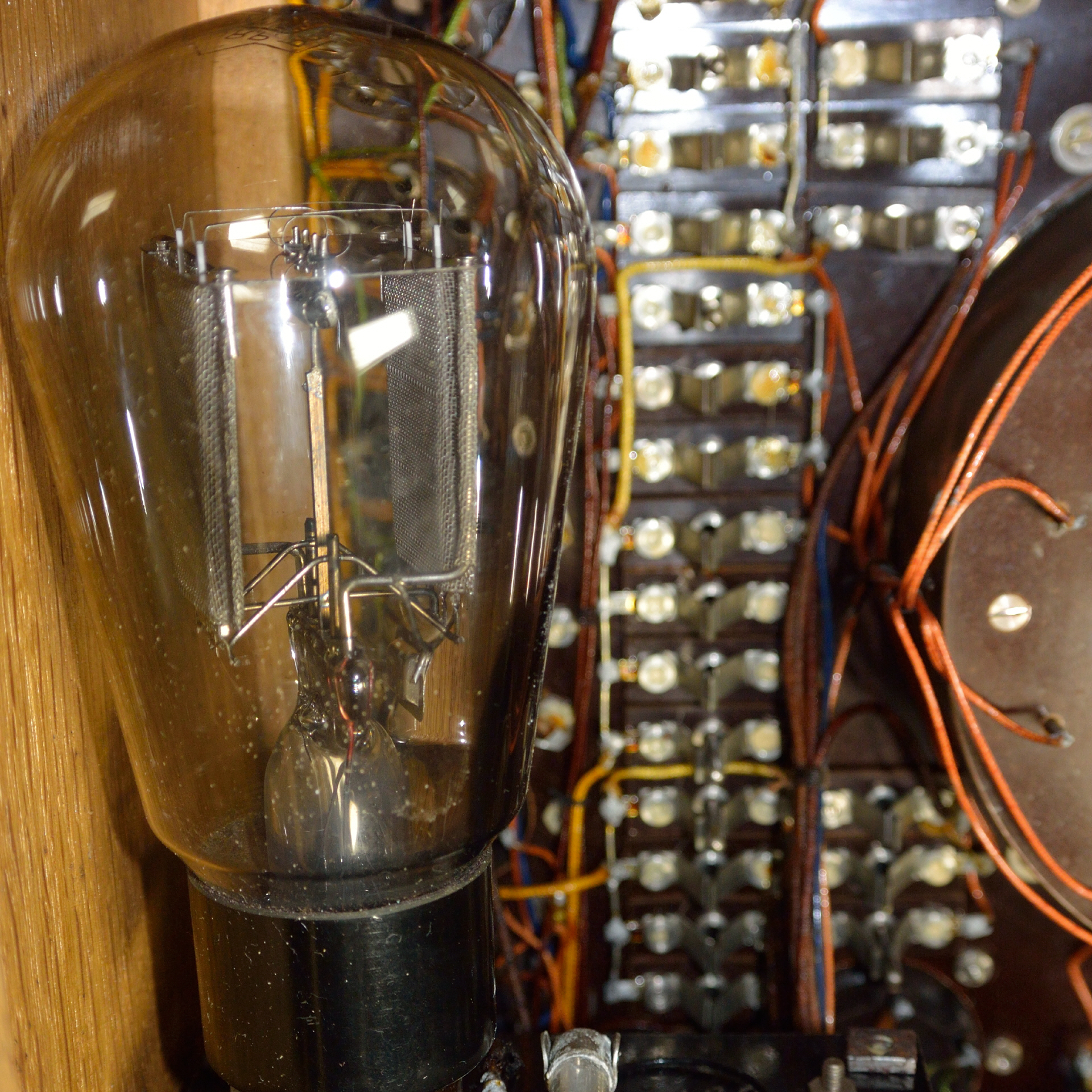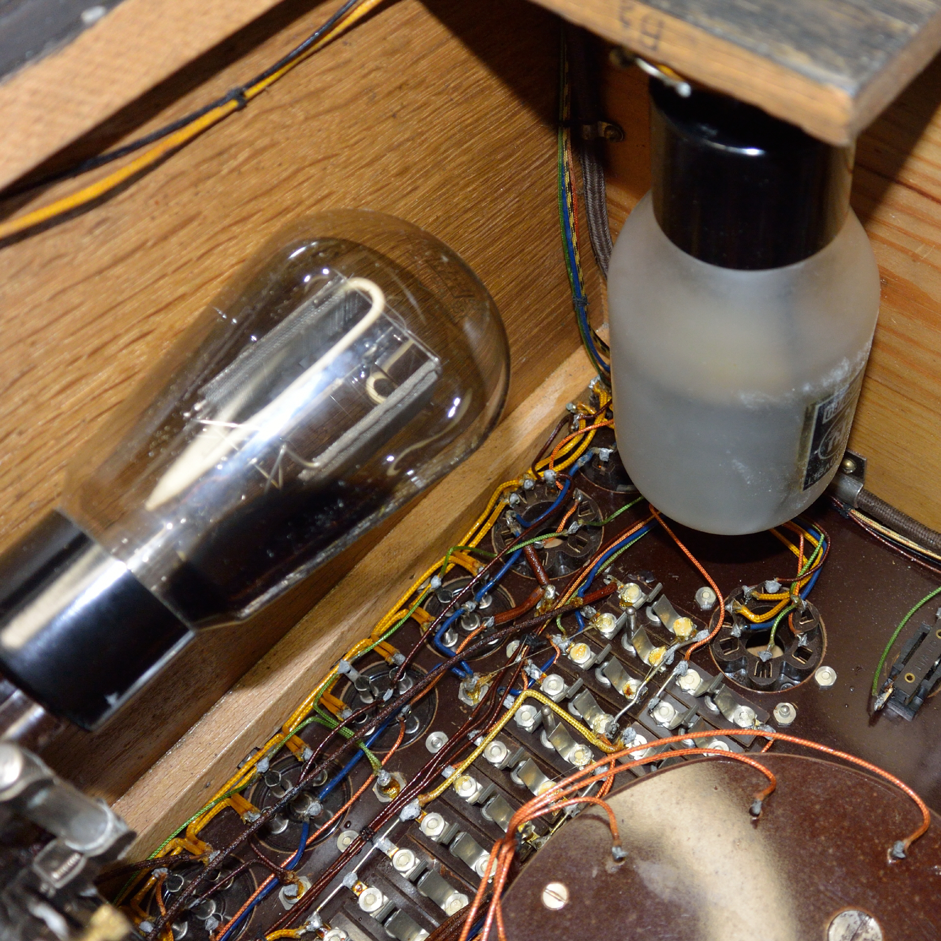 11 Röhrenfassungen sind verbaut: 4 x Europa 3/4/5 pol. 1 x Außenkontakt klein 2 x Außenkontakt groß 3 x Hexodenfassung 1 x Europa 5+1 pol. |