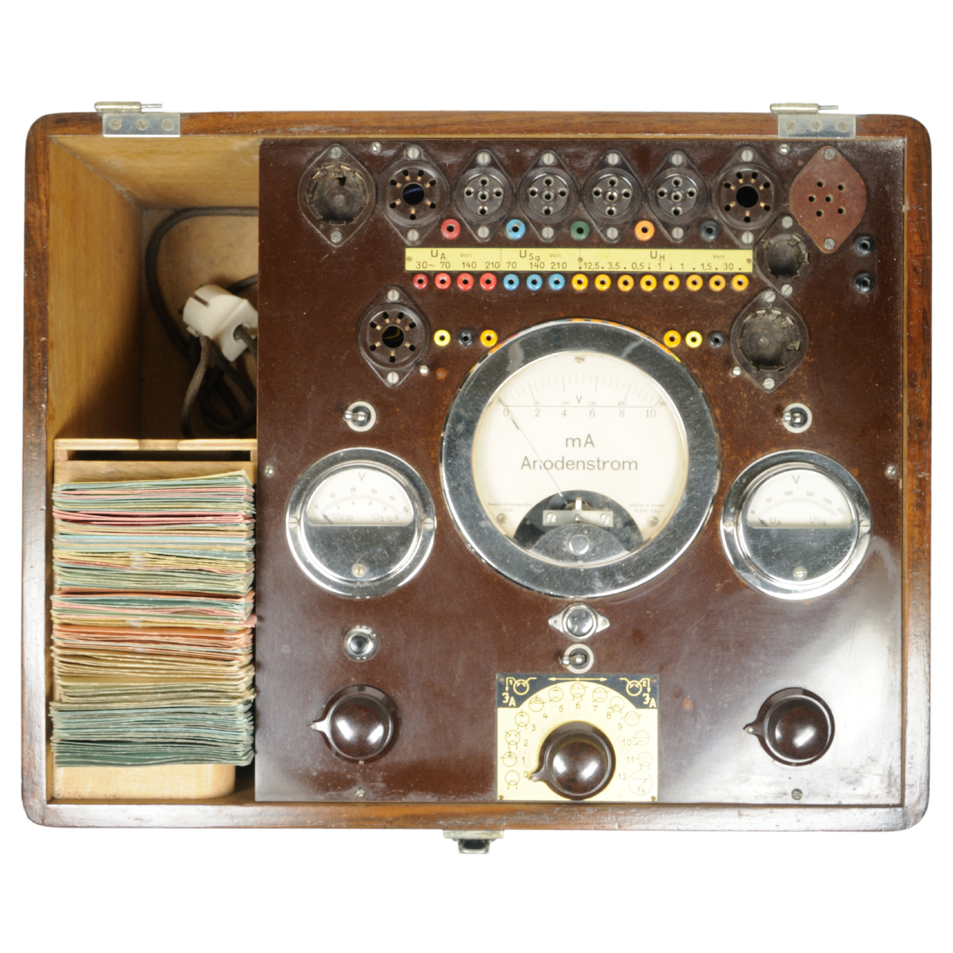Das Gerät ist speziell zur Kennlinienaufnahme ausgelegt. DIe normale Röhrenprüfung funktioniert identisch wie beim Modell W 3, die Prüfkarten sind kompatibel. Zusätzlich zu dem großen Instrument zur Messung des Anodenstroms sind seitlich zwei weitere, etwas kleinere Messgeräte zur Messung der Anoden- und Hilfsgitterspannung eingebaut. Die Spannungswerte können dabei über zwei Potentiometer stufenlos eingestellt werden. Alle zur Prüfung von Röhren benötigten Bedienelemente sind auf einer Hartpapierplatte montiert. Transformator, Kondensator und Widerstände sind innen direkt am Holzgehäuse befestigt. Neben der Bedienplatte befindet sich ein Fach für dir Prüfkarten, dahinter ein kleines Fach für Steckstifte und Kabel. Der Gehäusedeckel ist abnehmbar, eine Tabelle der prüfbaren Röhren ist auf der Innenseite des Deckels angebracht. |