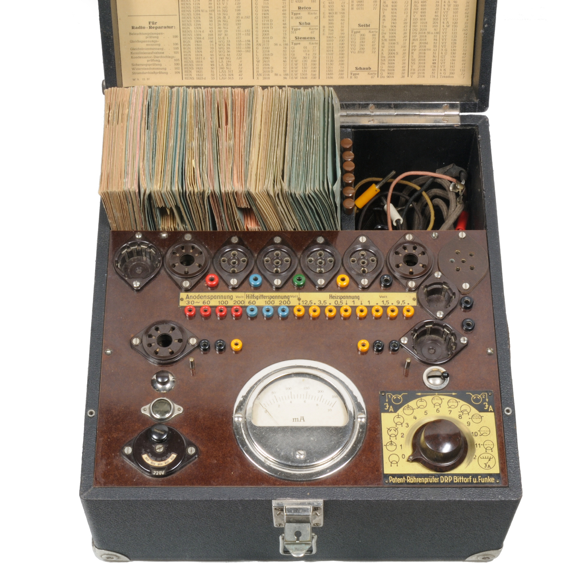 | Das Modell W9 ist die letzte Weiterentwicklung der 2. Generation der Patent-Röhrenprüfgeräte von Funke. Die bereitgestellten Heiz-Spannungen und die Prüfkarten entsprechen den Modellen W3 bis W7. | |