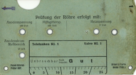Die Prüfkarten haben eine Abmessung von ca. 180 x 100 mm, sind gelocht (Metallösen) und mit einer runden Aussparung für das Messwerk ausgestattet. Die Karten besitzen eine Skala, die den oberen Teil des Messwerks überdeckt und mit "Unbrauchbar", "Noch brauchbar" und "Gut" beschriftet ist. Neben der mit der Karte zu prüfenden Röhrentypen sind auch die Prüfparameter (Anodenstrom, Anodenstrom-Messbereich, Hilfsgitterspannung und Heizspannung) aufgelistet. Alle Karten sind nummeriert und besitzen eine Aussparung (oder sonstiger Kennzeichnung) für die zu nutzende Röhrenfassung. Karten / Kartensätze: Es gab ca. 230 Prüfkarten und einige Zusatzkarten. |