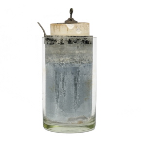 Das Bunsenelement ist eine von Robert Bunsen 1841 verbesserte Variante eines 1839 von William Grove entwickelten galvanischen Elements. Das Element von Grove bestand aus einer Zink-Elektrode, die in Schwefelsäure als Elektrolyt tauchte, umgeben von einem porösen Tonzylinder als Diaphragma; als Gegenelektrode diente Platin in Salpetersäure. Bunsen gelang es, die teure Platinelektrode durch einen Zylinder aus viel billigerer gepresster Kohle zu ersetzen. Das Bunsenelement war zu seiner Zeit eine der leistungsfähigsten elektrischen Stromquellen. |