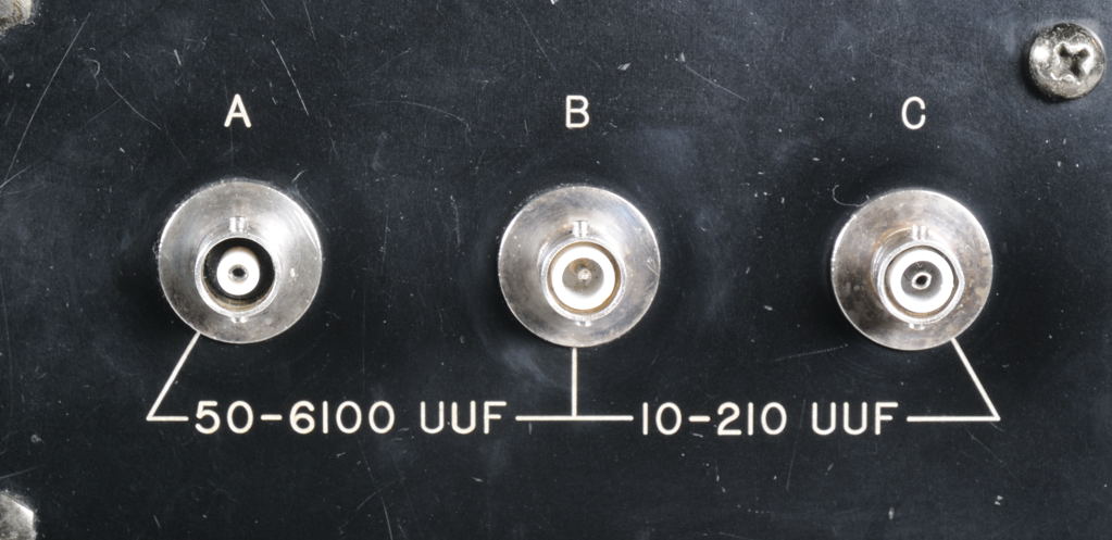 Die Kondensatoren C1 (50-1100 pF) und C2 (Stufen 0 / 1000 / 2000 / 3000 / 4000 / 5000 pF) sind in Serie geschaltet, daher können Werte zwischen 50 und 6100 pF stufenlos eingestellt werden. Der dritte Kondensator C3 hat einen Regelbereich von 10 bis 210 pF.