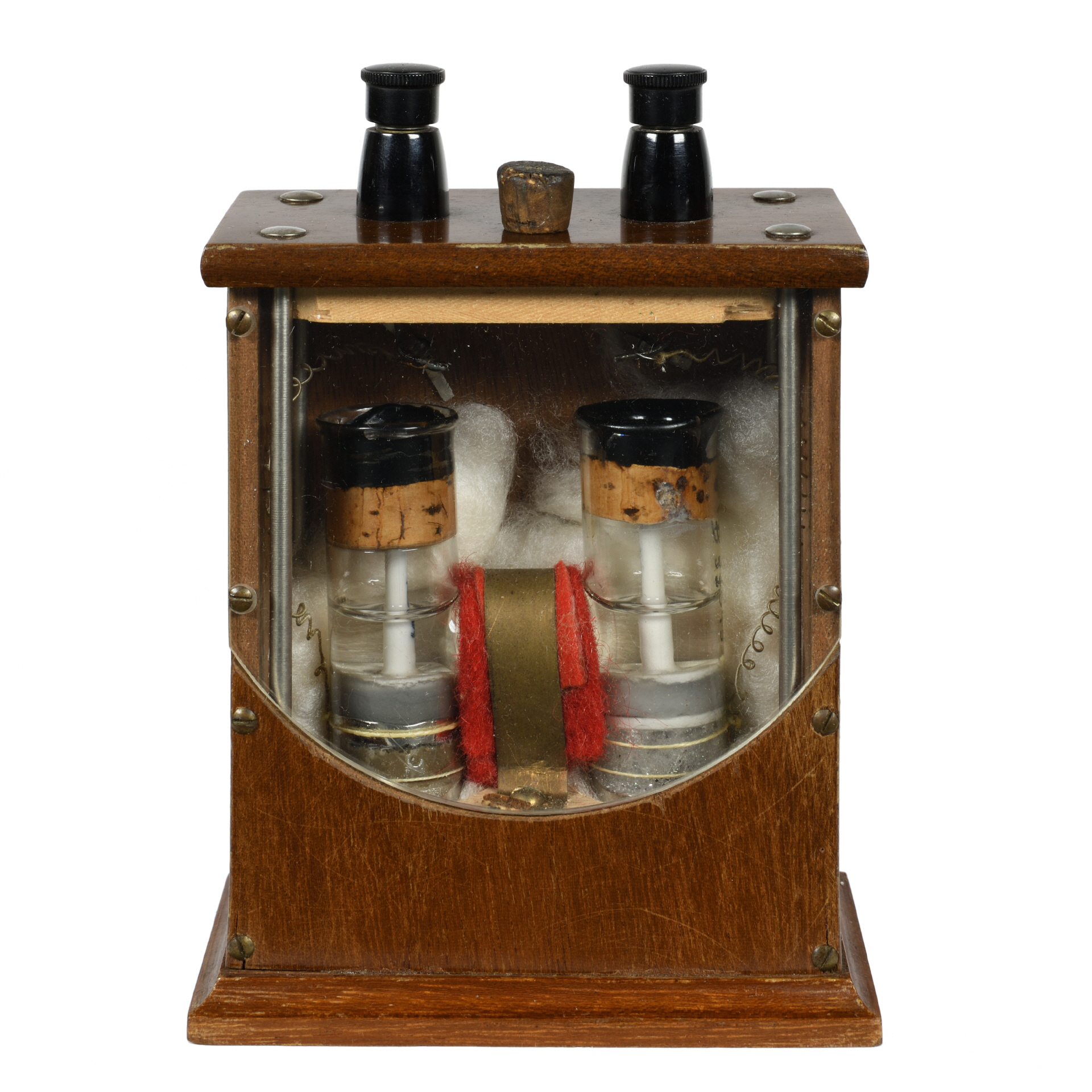 Eine detaillierte Beschreibung des Elements findet sich hier. Das Glasgefäß im Exponat ist oben mit Korkstöpsel verschlossen und zusätzlich mit Bitumen abgedichtet. Es handelt sich vermutlich um eine frühe Bauform, da spätere Glasgefäße oben verschmolzen wurden. |