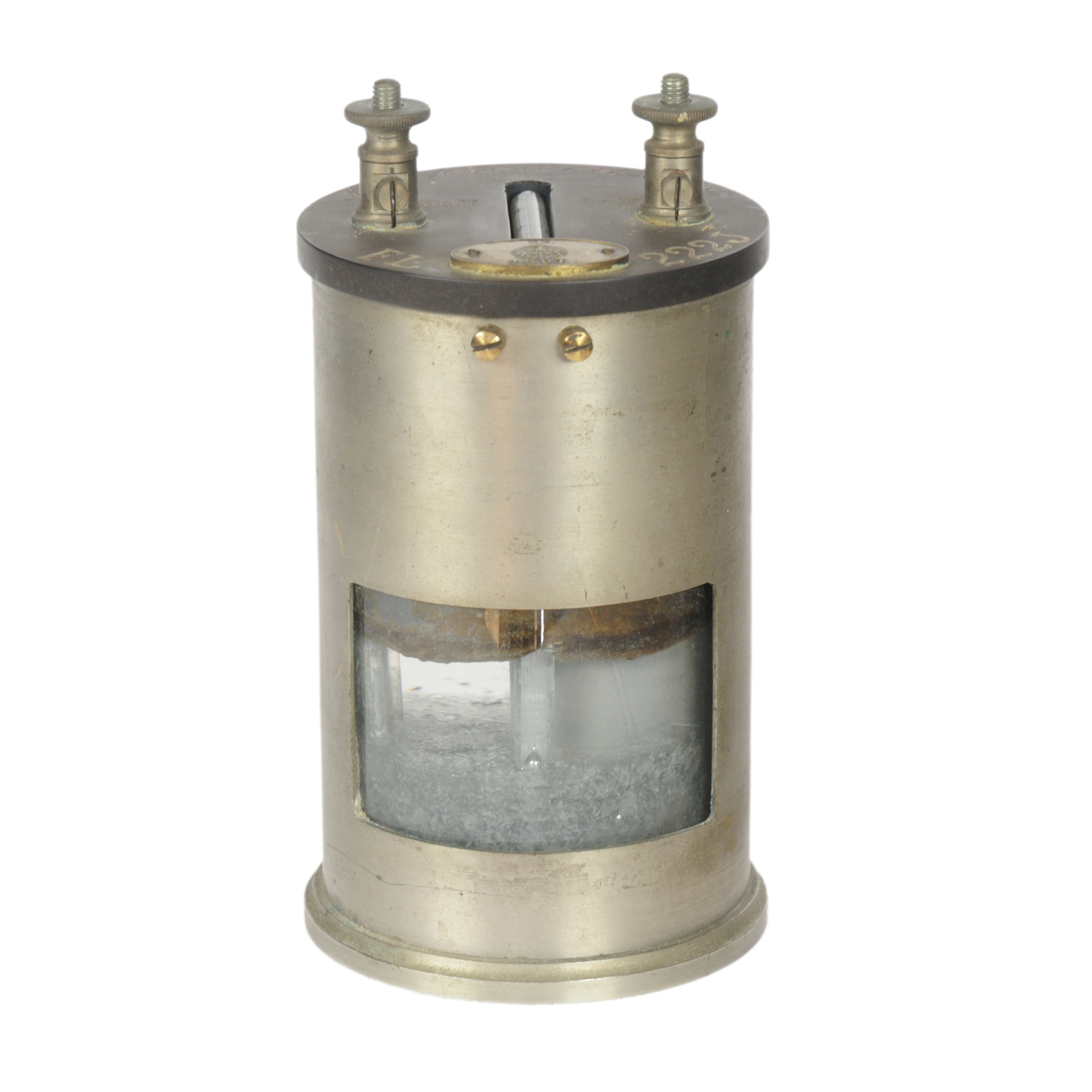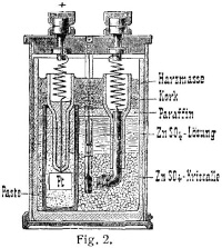 | Beschreibung | Das Element befindet sich in einem Messinggefäß mit Hartgummideckel und Klemmen mit Hartgummikappe und enthält ein beglaubigtes Thermometer. Das Element ist beglaubigungsfähig, da es versandfähig ist, ohne Gefahr, dass das Zink mit dem Quecksilber in Berührung kommen kann, da sich das Quecksilber in einer besonderen Tonzelle befindet. |