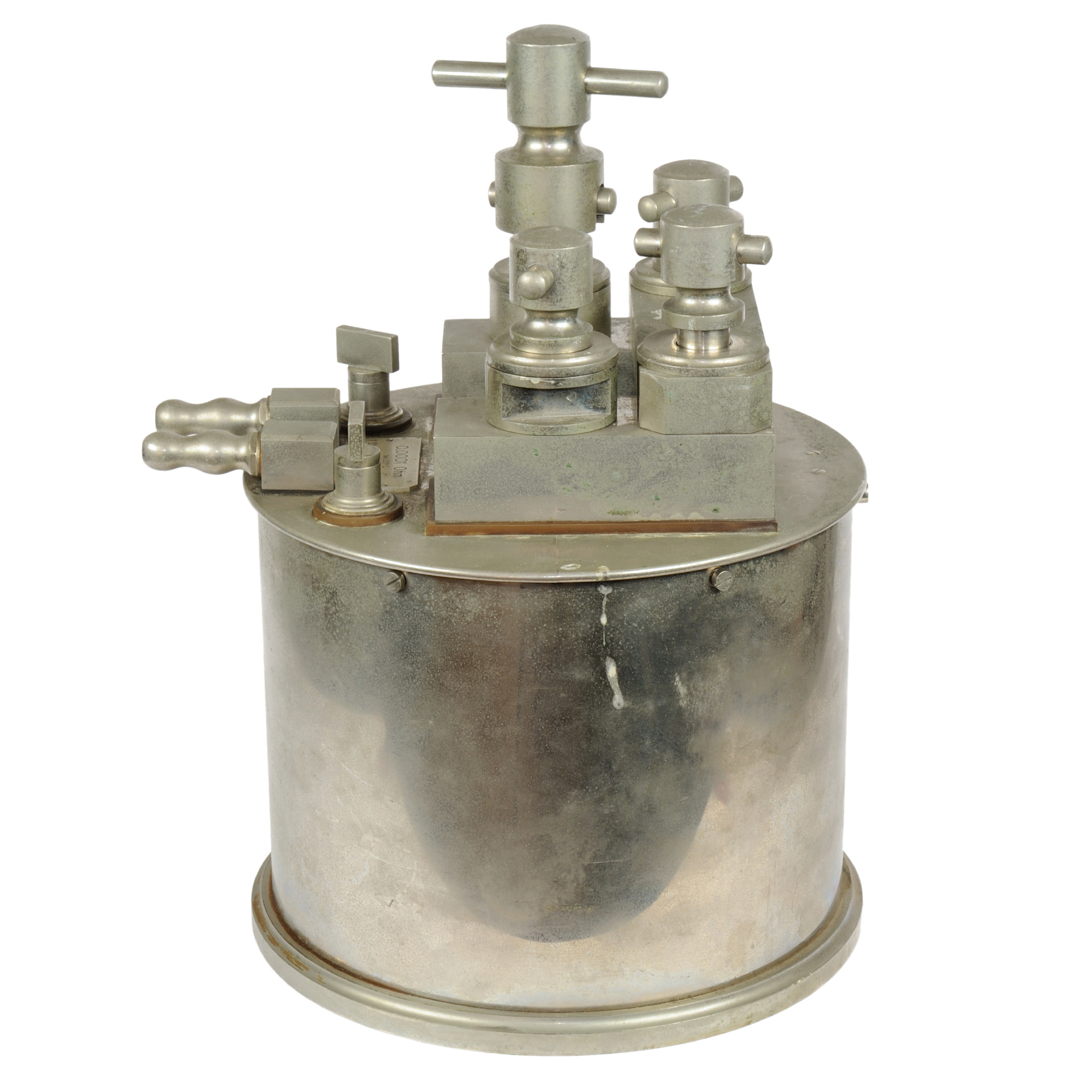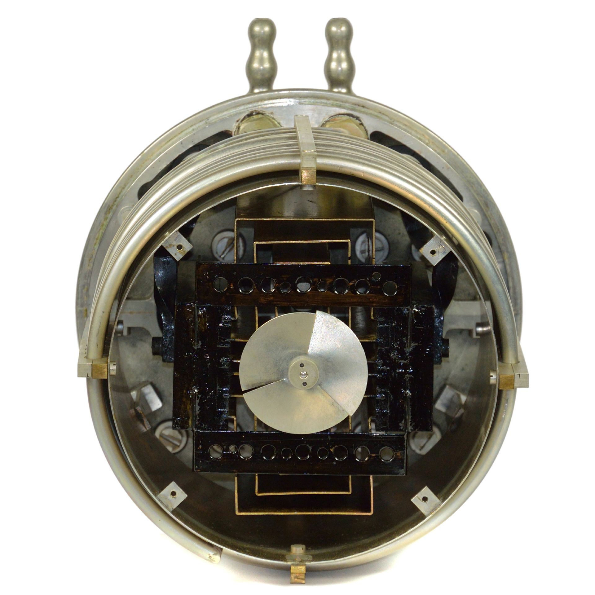 Der Widerstand, gefertigt aus mehreren parallel geschalteter Manganin-Bleche befindet sich im inneren eines großen, topfförmigen Gehäuses aus einer Nickel-Legierung. Rund um die Widerstandsbleche sind Kühlschlangen gelegt, durch die von außen Wasser zur Kühlung geleitet werden kann. Zusätzlich sitzt mittig ein Rührwerk, das von außen durch einen ELektromotor (nicht vorhanden) angetrieben werden kann, um die Kühlung des Systems zu verbessern. Zum Betrieb wird das Gefäß mit Petrolium, als primärer Kühlflüssigkeit, gefüllt. Das Petrolium kann oben über zwei Öffnungen eingefüllt werden, unten befindet sich auf der Rückseite eine Abflußöffnung, die durch eine Schraube mit Gummidichtung verschlossen ist. Der Stromanschluß erfolgt über zwei große Schraubklemmen (M18 Schrauben, 9,5 cm lang, ca. 0,3 kg). Um den Widerstand zu überbrücken, ist hinter den Schraubklemmen ein Kurzschlußbügel, gefertigt aus einer Nickel-Legierung (145 x 45 x 20 mm, ca. 1 kg). Dieser Bügel ist auch über zwei Schraubklemmen fixiert. Um diese Schraubklemmen festziehen zu können, liegt dem WIderstand ein spezieller Steckschlüssel bei (40 x 75 mm, ca. 0,5 kg), der auf die Schraubklemmen einfach aufgesteckt werden kann. Dieser Schlüssel ist, wie auch alle anderen Metallteile des Geräts, aus einer Nickel-Legierung gefertigt. Mit angeschlossener Zusatzkühlung können mit diesem Widerstand Stromstärken bis 2500 A präzise gemessen werden. |