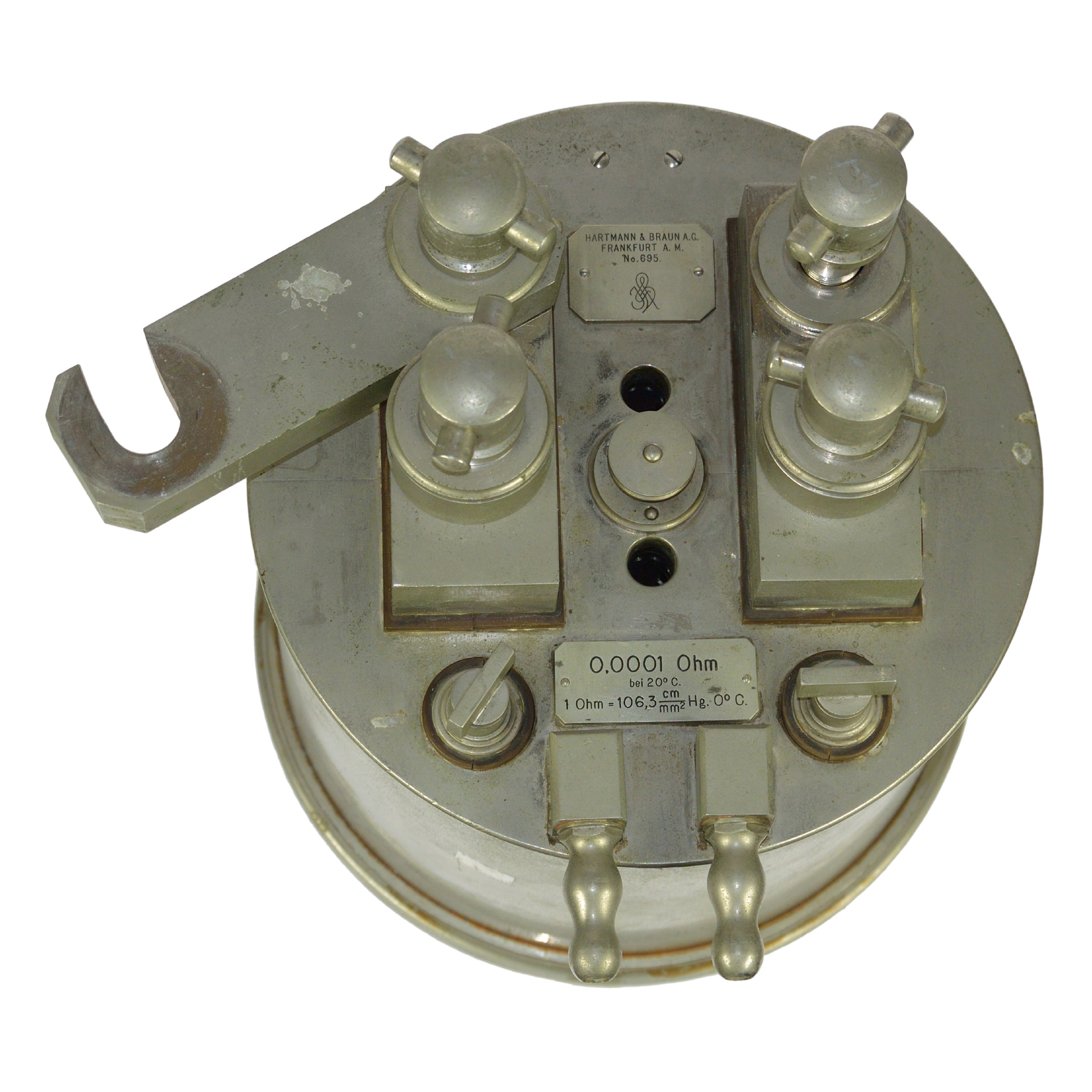 Oberes Schild: "HARTMANN & BRAUN AG FRANKFURT A.M." "No. 695" H&B Monogramm Unteres Schild: "0,0001 Ohm bei 20 °C" "1 Ohm = 106,3 cm/mm2; Hg. 0 °C" |
