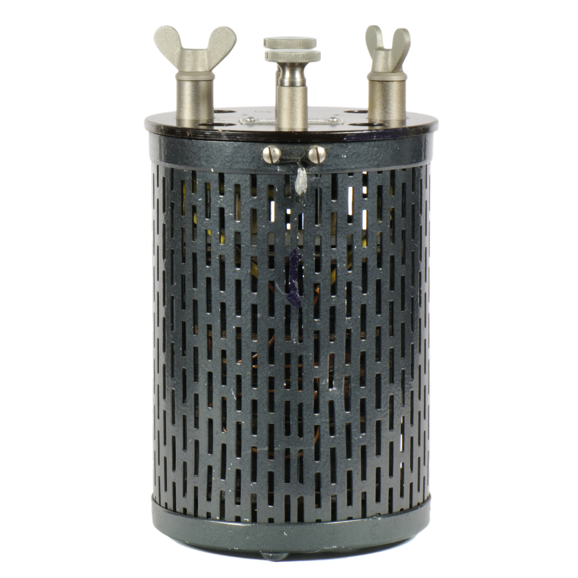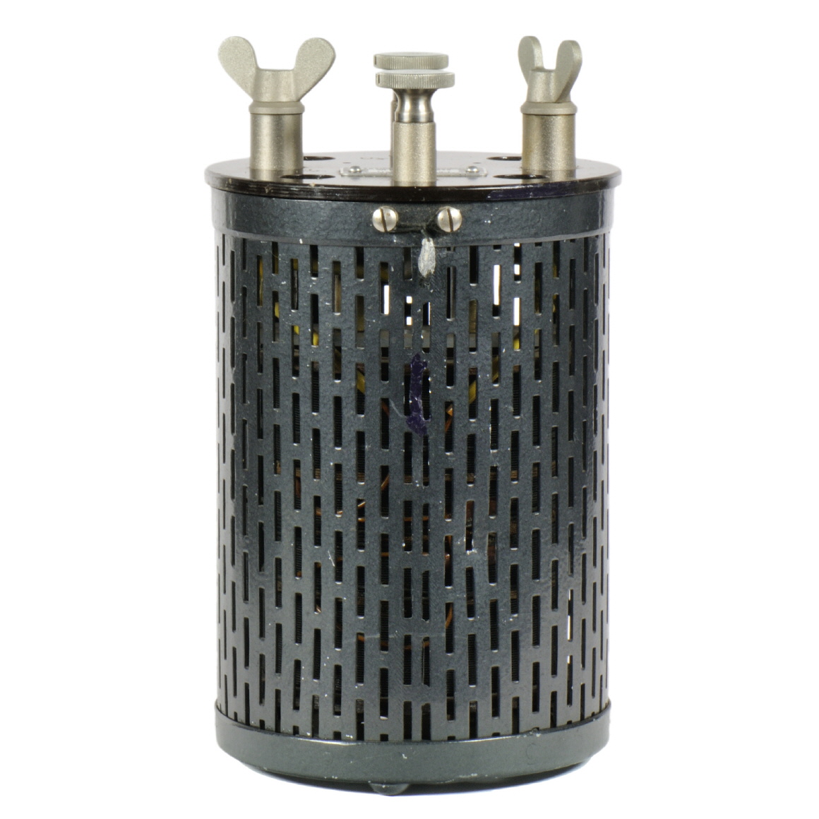 Der Widerstand ist in einem zylindrischen Gehäuse von 104 mm Durchmesser und 150 mm Höhe eingebaut. Der Widerstand ist für den Betrieb in einem Ölbad (Petroleumbad) zur Kühlung ausgelegt. Die obere Deckplatte ist aus Konststoff gefertigt. Im Inneren ist der Widerstandsdraht (Manganin) ist auf einer Messingrohr von 70 mm Durchmesser und 90 mm Länge gewickelt. |