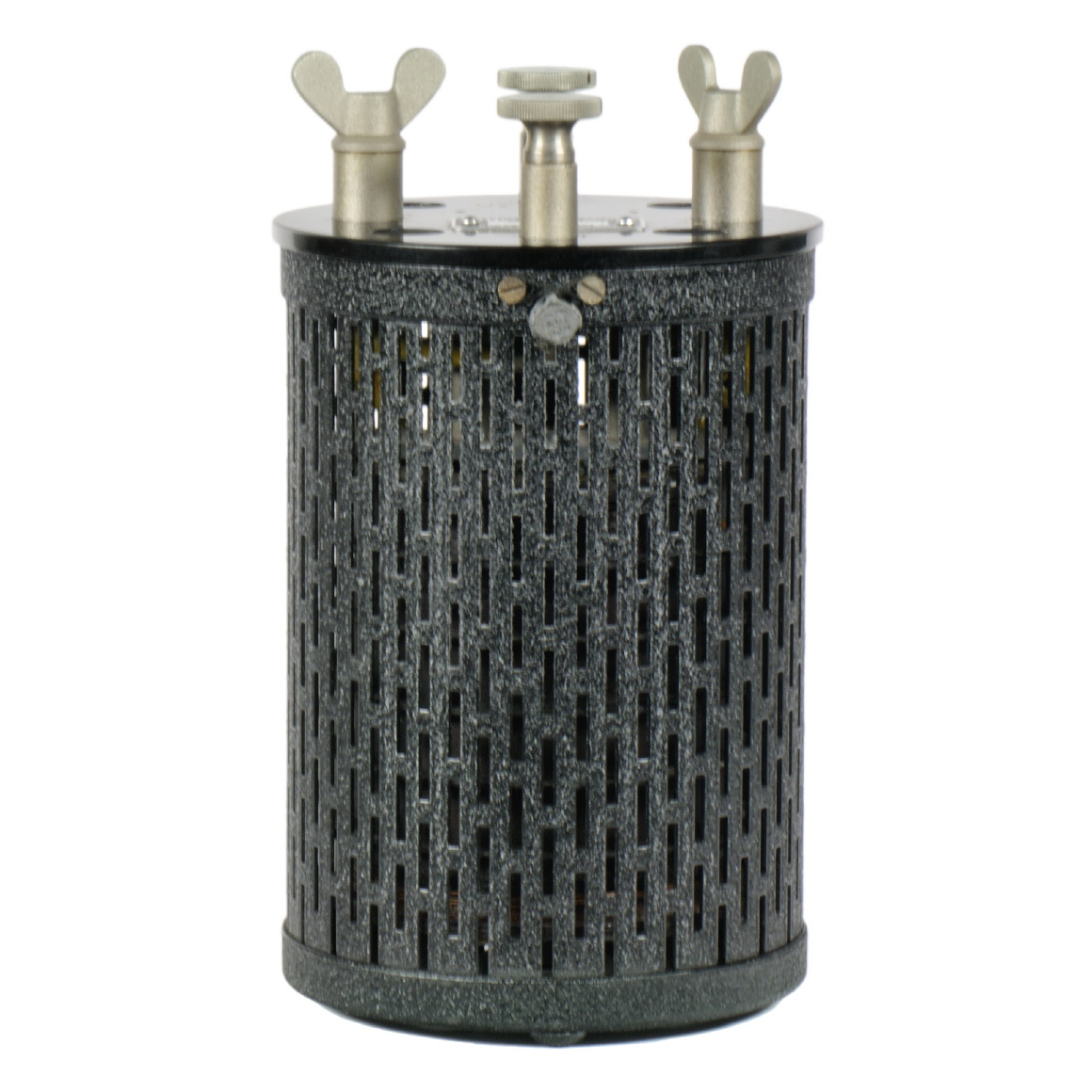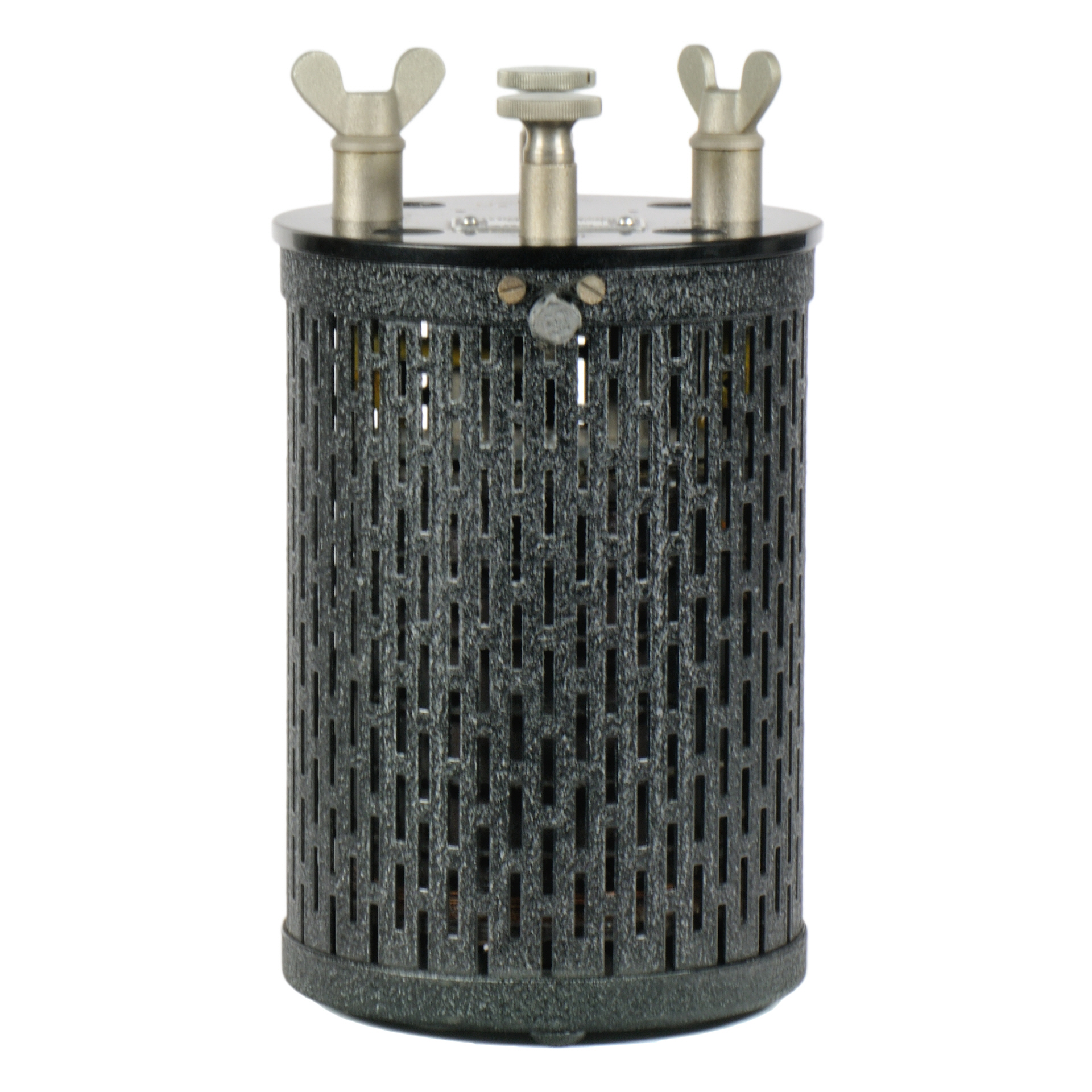 Der Widerstand ist in einem zylindrischen Gehäuse von 104 mm Durchmesser und 150 mm Höhe eingebaut. Der Widerstand ist für den Betrieb in einem Ölbad (Petroleumbad) zur Kühlung ausgelegt. Die obere Deckplatte ist aus Konststoff gefertigt. Im Inneren ist der Widerstandsdraht (Manganin) ist auf einer Messingrohr von 70 mm Durchmesser und 90 mm Länge gewickelt. |