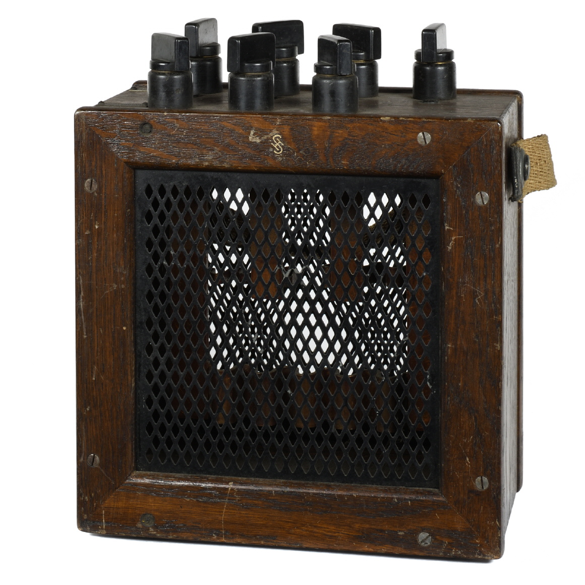 Die Nebenwiderstände sind in einem Holzkasten eingebaut, der auf der Vorder- und Rückseite ein großflächiges Lüftungsgitter besitzt. Der Starkstromanschluß erfolgt über die vier Klemmen, beschriftet mit "A" "10" "25" "100". Das Messgerät wird an die drei Klemmen, beschriftet mit "A" "10" "25/100", angeschlossen. Der Holzkasten besitzt einen Tragsriemen aus Leinen. |