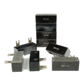 Jeder Widerstand spezifiziert einen Messbereich: 2,5 / 3 / 5 / 7,5 / 10 / 15 / 20 / 25 / 30 / 50 / 75 / 100 / 150 / 200 / 250 / 300 / 500 / 750 mA 1 / 1,5 / 2 / 2,5 / 3 / 5 / 7,5 / 10 / 15 / 20 / 50 / 100 / 200 A |