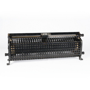 Der Schiebewiderstand befindet sich optisch in einem guten Zustand. Das Gerät besitzt einen Spulenkörper aus Keramik, der in einer Halterung aus Alu-Guß, schwarz lackiert, eingespannt ist. Der Schieber ist oben auf einer Schiene (Messing-Legierung) angebracht, die durch eine Blechabdeckung geschützt ist. Die Griffe des Schiebers sind aus Kunststoff. Die Lackschicht ist beschädigt, diverse Roststellen sind vorhanden. Die Wicklung ist technisch in Ordnung, 28 Ohm. Der Schleifkontakt lässt sich leicht bewegen. |