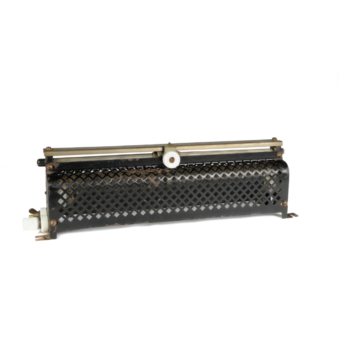 Der Schiebewiderstand befindet sich optisch in einem guten Zustand. Eine Porzellan-Anschlussklemmen wurden in der Vergangenheit durch eine Messing-Flügelmutter ersetzt, alle übrigen Teile befinden sich im Originalzustand. Das Gerät besitzt einen Spulenkörper aus Porzellan, der in einer Halterung aus Blech, schwarz lackiert, eingespannt ist. Der Schieber ist oben auf einer Schiene (Messing-Legierung) angebracht, die durch eine Blechabdeckung mit aufgedruckter Skala geschützt ist. Der Abgreifer hat oben einen Zeiger, um die Einstellung des Widerstands ablesen zu können, die Griffe des Schiebers sind aus Porzellan. Die Lackschicht ist beschädigt, diverse Roststellen sind vorhanden. Die Wicklung ist technisch in Ordnung, 310 Ohm. Der Schleifkontakt hat stellenweise Kontaktprobleme. Der Schiebewiderstand besitzt zwei Abgriffe, einen am Widerstand und einen am Schleifkontakt. |