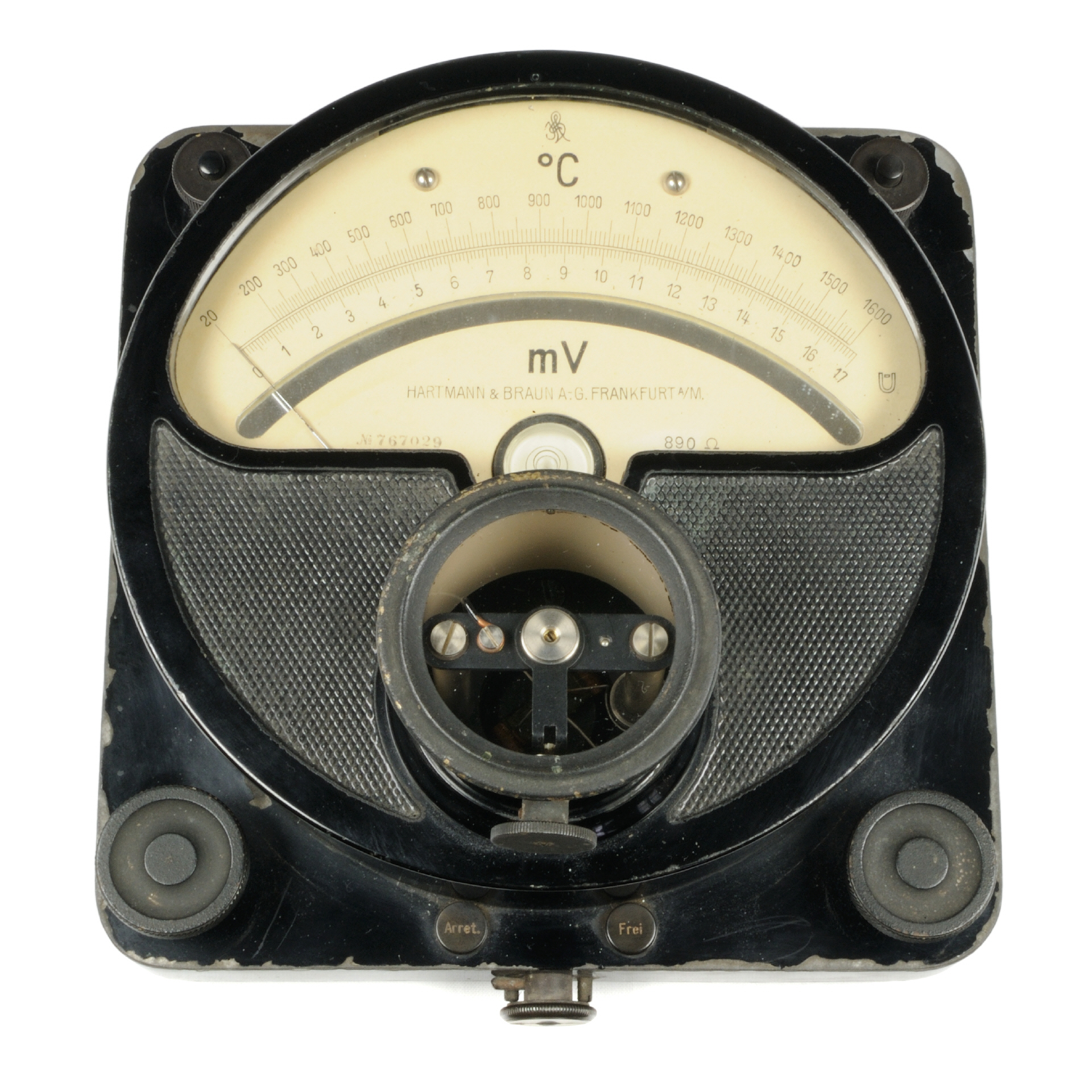 Bei diesem Exponat handelt es sich um ein Zeigergalvanometer. Das Gerät wurde aber nicht zur Strommessung eingesetzt, sondern zur Temperaturanzeige. die Skala besitzt eine Einteilung bis 1600 °C bzw. 17 mV. Der dazu passende Temperatursensor ist leider nicht vorhanden.