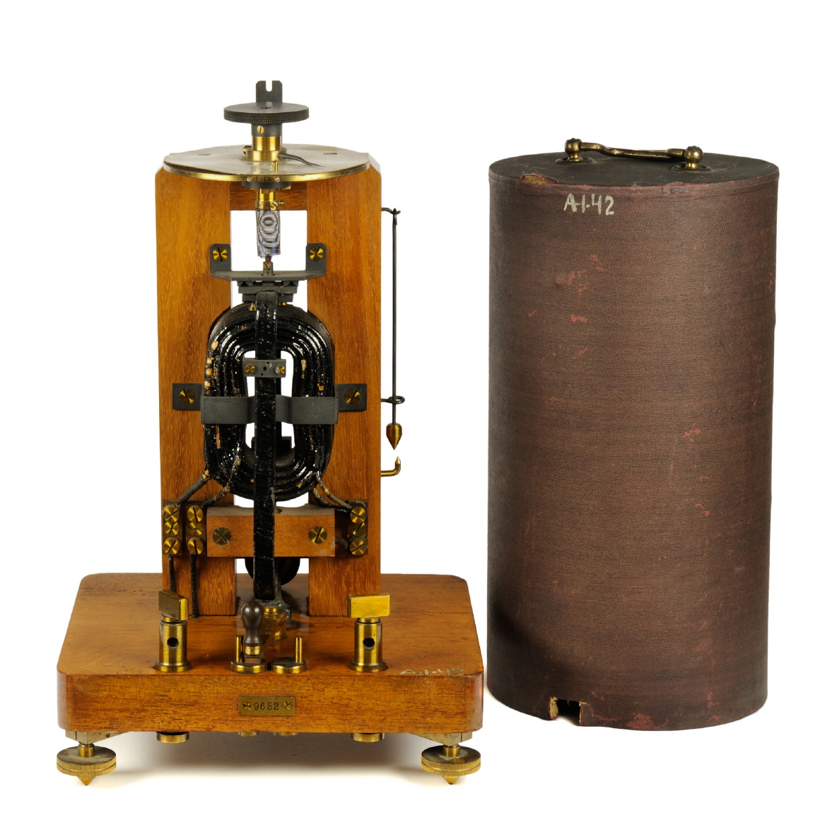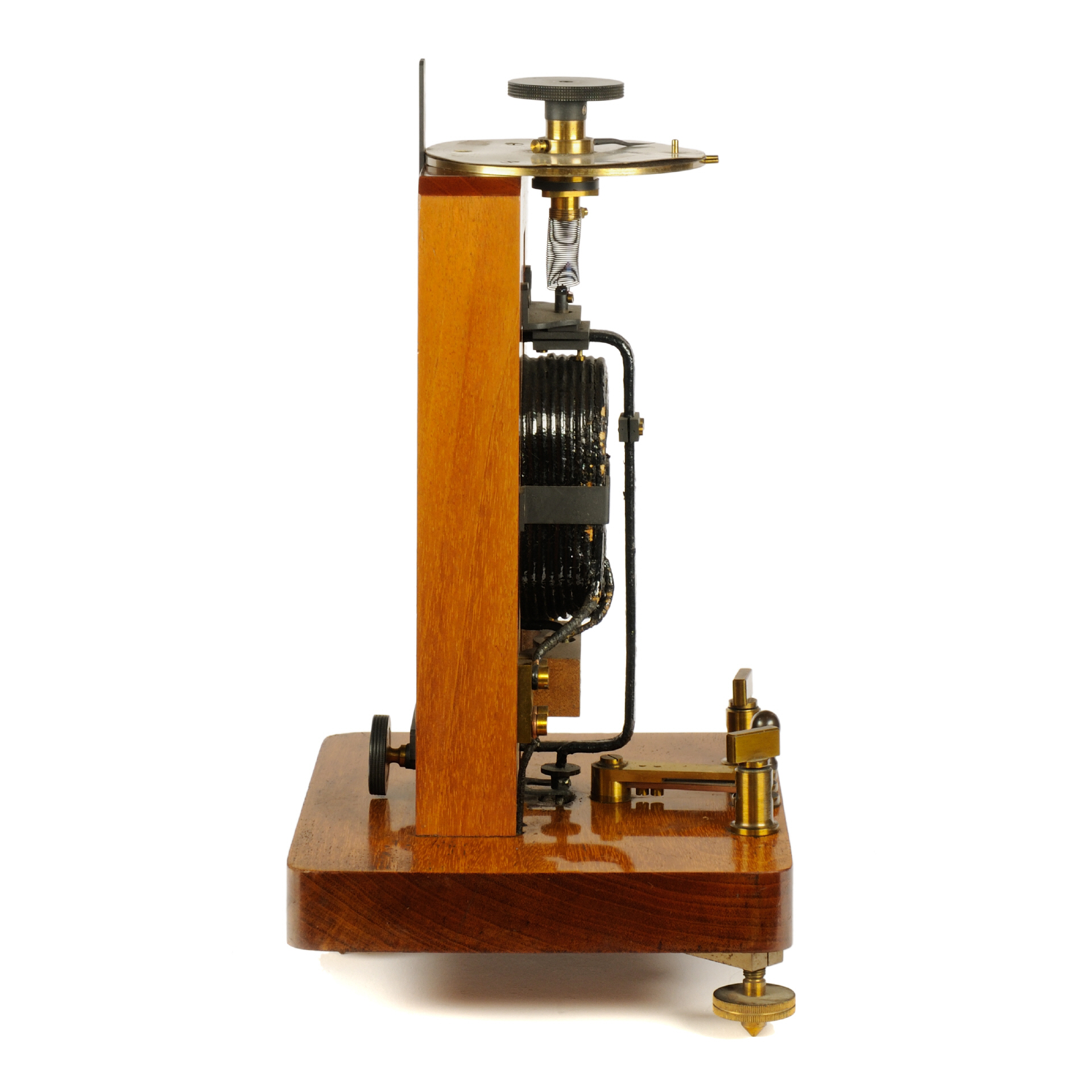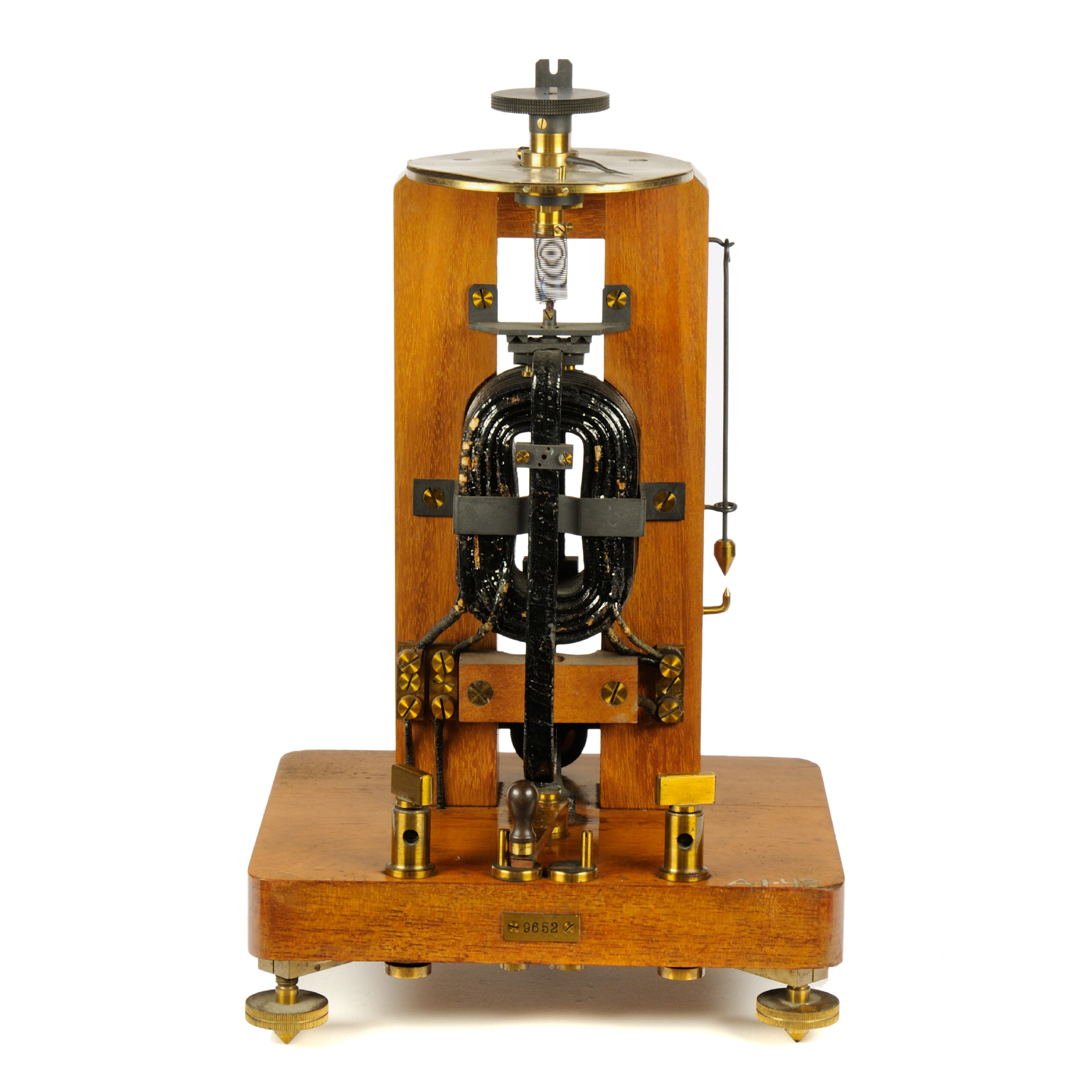 Das Messwerk ist auf einer 29 mm dicken Mahagoni-Platte befestigt, die über drei in der höhe verstellbarer Nivellierfüße waagerecht ausgerichtet werden kann. Der Stromanschluß erfolgt über zwei Messing-Klemmen. Das Gerät besitzt zwei feste Spulen, die über den Schalter auf dem Holzsockel umgeschaltet werden kann. Die bewegliche Spule spielt in zwei Quecksilbernäpfen (wobei diese beim Exponat nicht mehr gefüllt sind). Die Arretierung erfolgt über eine Schraube auf der Rückseite des Geräts. |