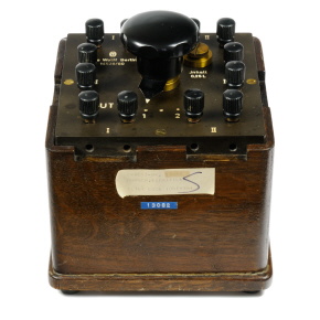 | Material | Holzgehäuse, Grundplatte aus Ebonit, Messing, Pressstoff, Manganin, Blech, Petrolium (als Kühlflüssigkeit) |