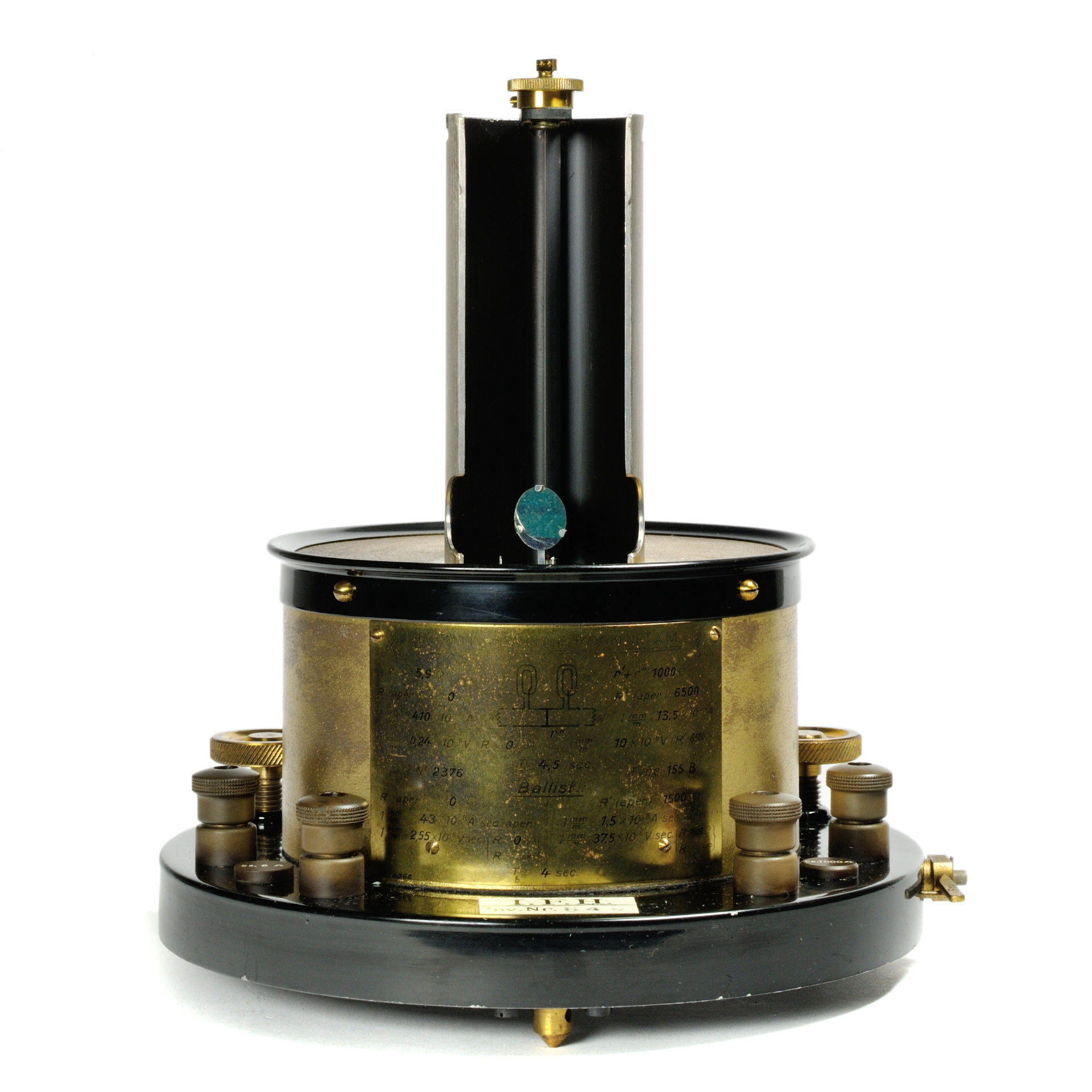 Messingschild auf dem Gehäuse (teilweise schwer lesbar): Seriennummer 2376 - Type 155 B Ballistisches-Galvanometer |