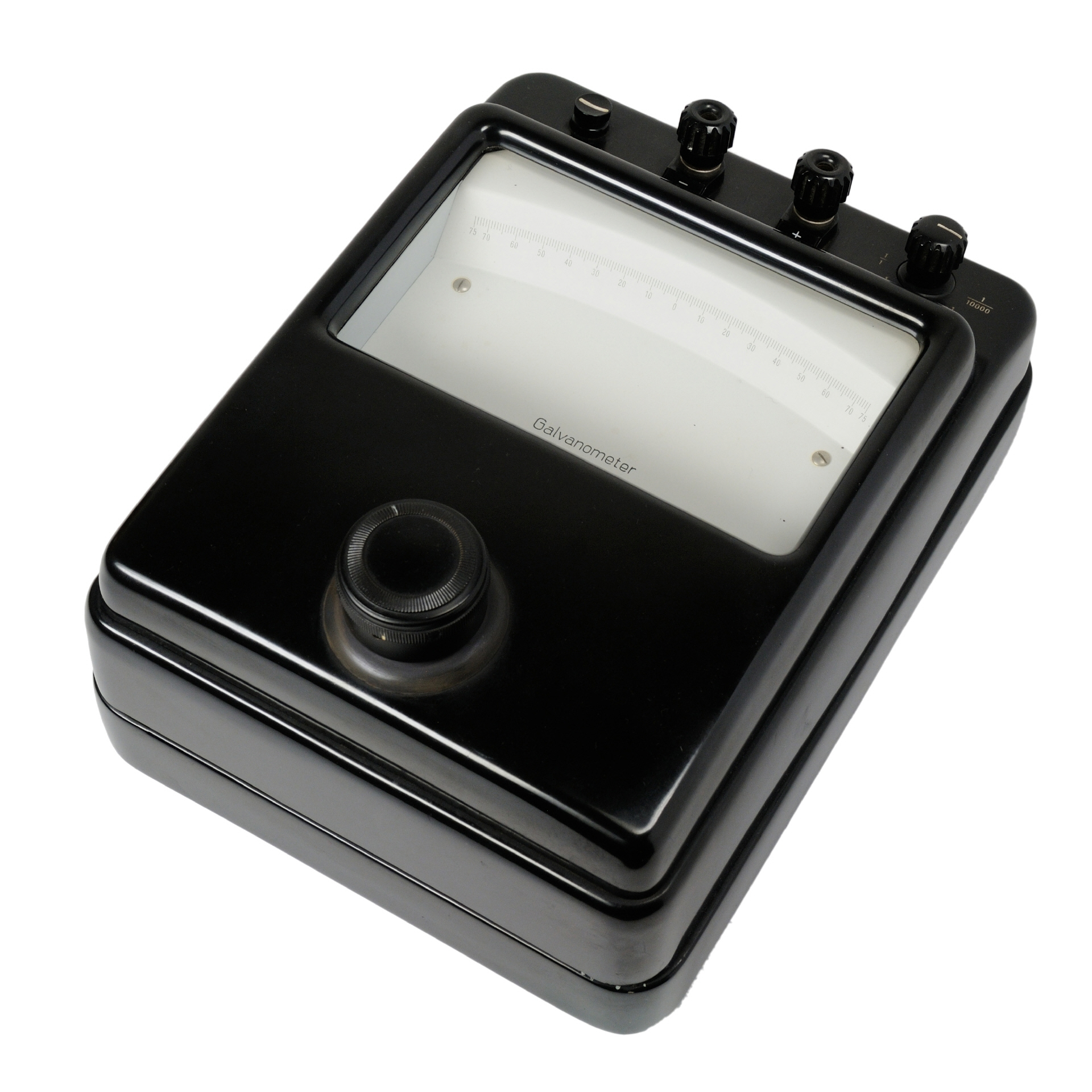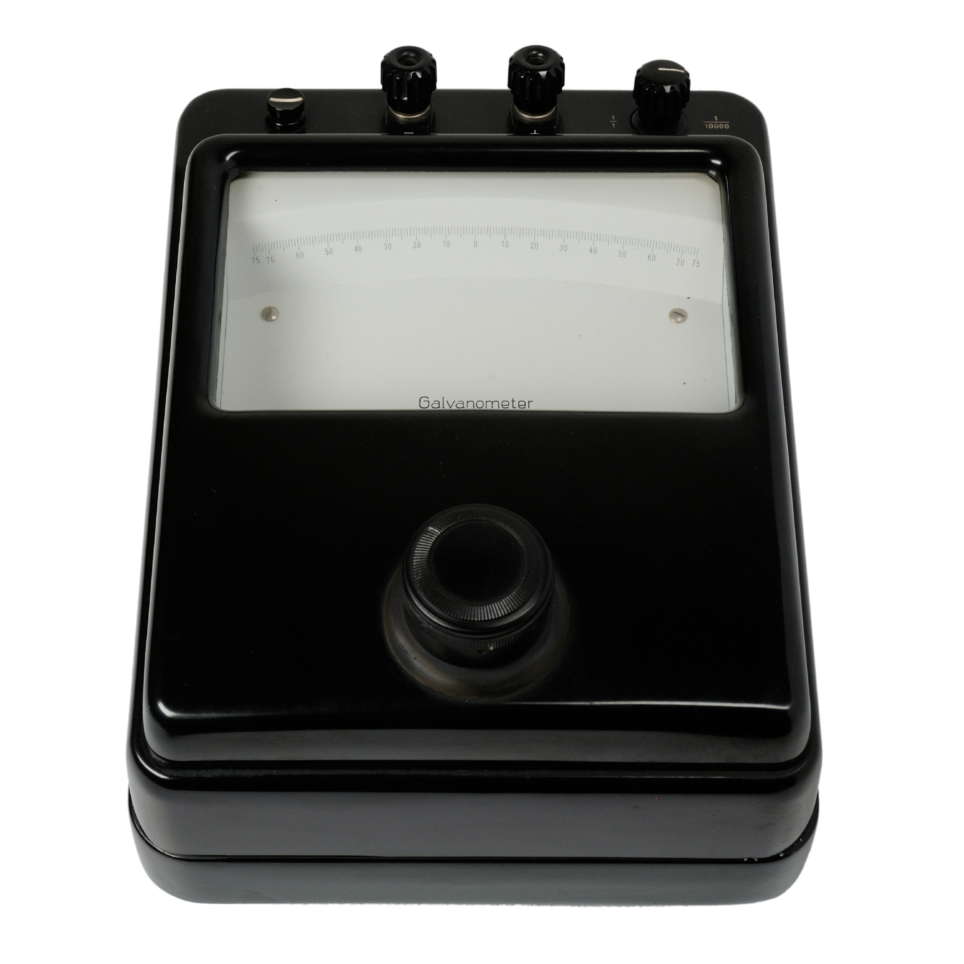 Ungeeichtes Lichtmarken-Galvanometer, in der Ausführung mit 2 Anschlussklemmen und feststellbarer Arbeitstaste, die in der Ruhestellung das Messwerk kurzschließt. Das Gerät besitzt eine gleichmäßig geteilte Skala, ± 75 Skalenteile, der Nullpunkt ist in der Mitte. Als Lichtquelle ist auf der Rückseite eine 6 V Lampe vorhanden. Neben den Anschlussklemmen findet sich der Empfindlichkeitsregler (Teiler 1/1, 1/10, 1/100, 1/1000, 1/10000) zur Messbereichserweiterung. Die Justierung des Lichtzeigers erfolgt durch den großen Drehregler auf der Oberfläche. Das gesamte Messwerk sitzt in einem abgedichteten Pressstoffgehäuse auf einem Sockel aus Aluminium (Guss). Das Gerät besitzt vier Gummifüße, um Erschütterungen von außen auf das Messwerk zu verringern. |