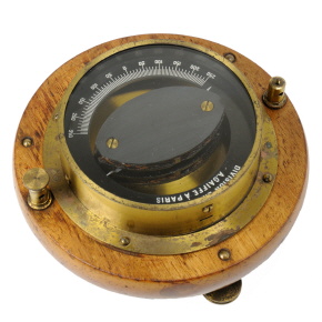 Das Galvanometer besitzt einen zentralen, runden Holzkörper, der über drei nivellierbare Füße waagerecht ausgerichtet werden kann. Das Messwerk selbst findet sich in einer Messing-Dose, die über einen Haltering auf der Holzplatte befestigt ist. Durch leichtes Lösen der Schrauben des Halterings kann die Dose nach Norden ausgerichtet werden. Die Stromzufuhr erfolgt über die beiden Kontaktklemmen auf der Holzplatte, die über Schleifkontakte an das Messwerk geleitet werden. Das Gerät besitzt ein sehr interessantes Messwerk: Der Draht des Multiplikators ist bei diesem Galvanometer in Riefen des Rahmens so gewickelt ist, dass jeder zur Schwingungsebene der Nadel parallele Schnitt nahezu die Form zweier Brennlinien zeigt, die mit ihren konkaven Seiten einander so gegenüberstehen, dass die einspringenden Spitzen derselben in der Nähe der Rotationsachse der Nadel liegen. Bei dieser Wicklung bildet einerseits die Nadel in allen Lagen nahezu gleiche Winkel mit den in der Nähe der Pole liegenden Teilen des Multiplikator-Drahtes, andrerseits liegt der Magnetpol dem Stromkreise in dem Maße näher, als die Einwirkung des Erdmagnetismus auf die Nadel grösser wird. Die Ausschläge der Nadel sind in dem beschriebenen Galvanometer bis etwa 70° zu beiden Seiten der Ruhelage den Stromstärken proportional. |