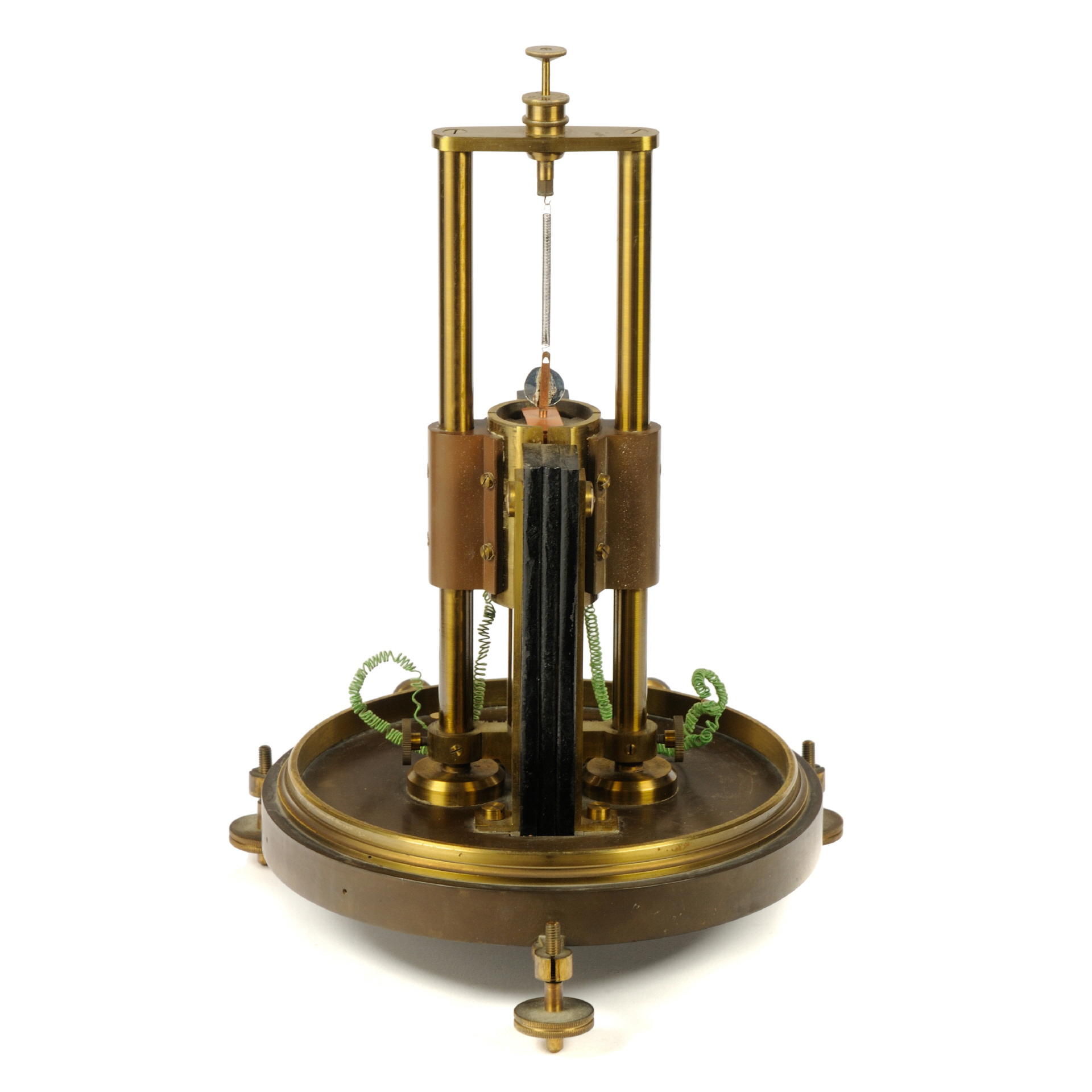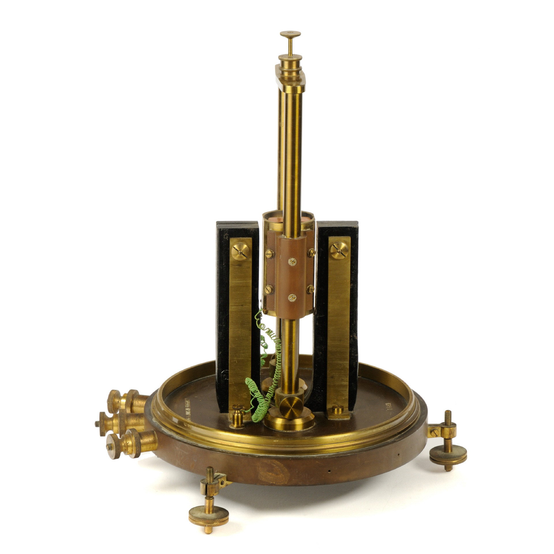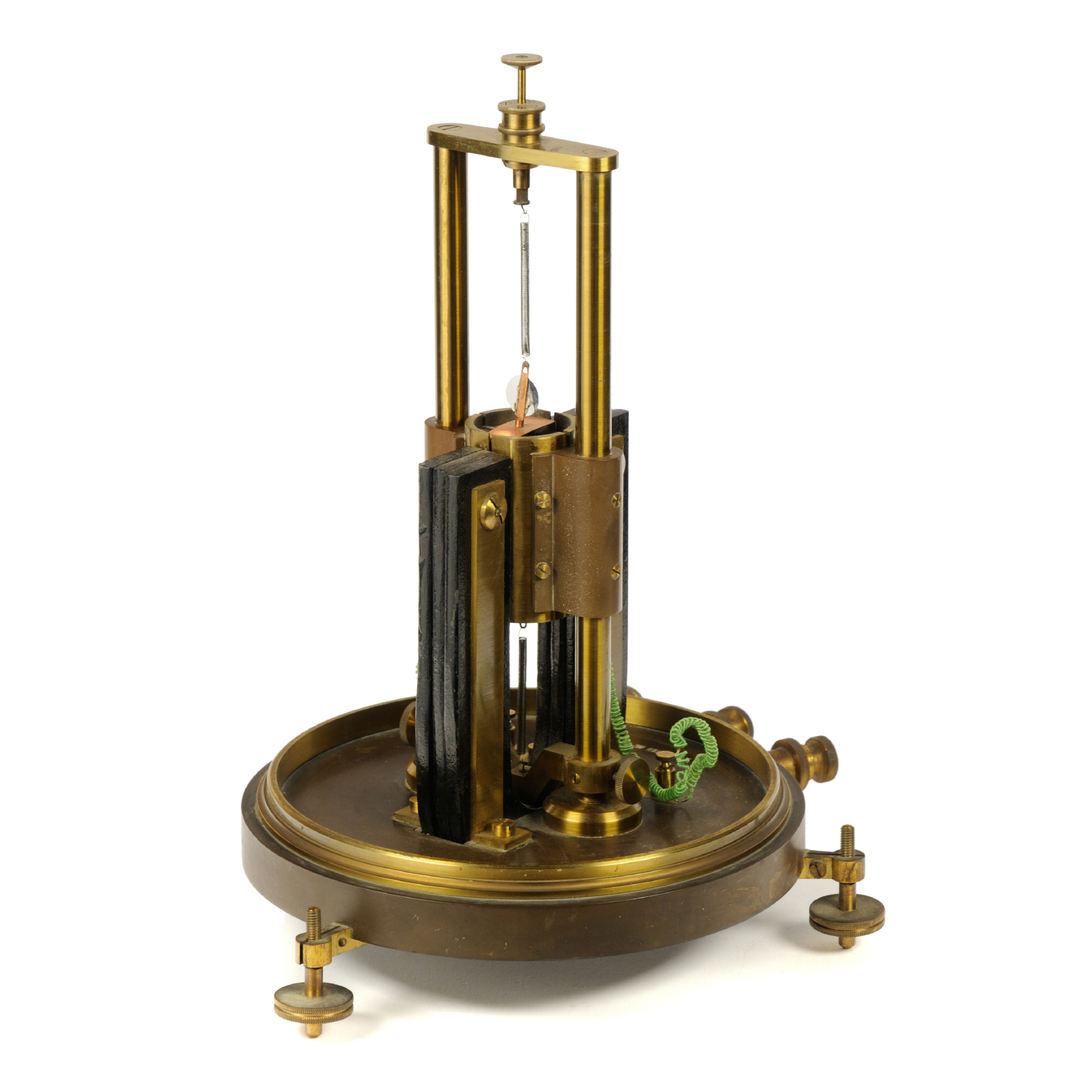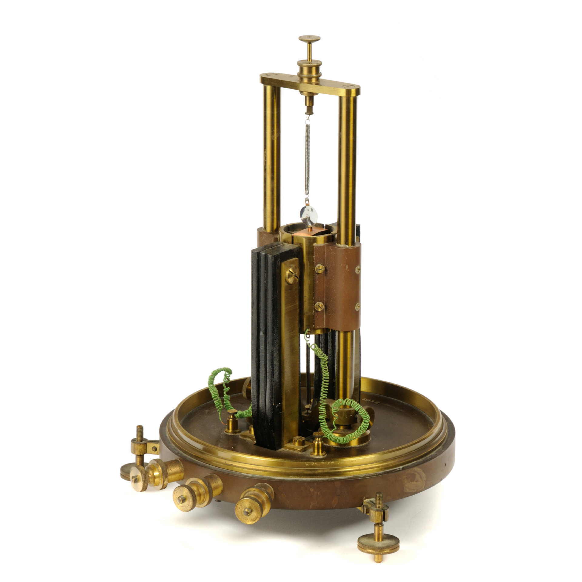 Vorab, Zweck und Funktionsweise dieses Geräts sind mir (noch) nicht bekannt. Das Gerät, hergestellt von J. Carpentier, wahrscheinlich im 4. Quartal des 19. Jahrhunderts, soll (unbestätigt!) von den Wissenschaftlern Grimaldi und Platania für Experimente rund um Polarisation und Depolarisation von dünnen Metallfolien, einschließlich Gold, Silber verwendet worden sein (das Gerät stammt aus Rom, Italien). Der Aufbau des Geräts erinnert an ein Spiegelgalvanometer bzw. ein Quadranten-Electrometer (nach Lord Kelvin), weist aber gravierende konstruktive Änderungen auf. Die Basis bildet eine dicke Ebonit-Platte mir drei nivellierbaren Standfüßen und drei Anschlussklemmen aus Messing. In der Mitte der Platte ist das Messwerk, befestigt auf zwei Messing-Säulen, welche einfach demontiert werden können (Rändelschrauben). Außerhalb des drehbar gelagerten Messwerks sitzt ein großer, kräftiger U-Magnet. Zwischen den Schenkeln dieses Magneten befindet sich ein feststehender "Kern", bestehend außen aus 4 Messingpolen (Quadranten), von denen zwei mit den äußeren Klemmen verbunden sind, die anderen beiden haben keine sichtbare Verbindung. Im Inneren befindet sich ein Eisenkern, der mittig durch eine Ebonitplatte geteilt ist (90° zur Achse des Magneten. Im Luftspalt zwischen diesem Eisenkern und den Messingpolen spielt eine "Spule", hier eine dünne Kupferfolie, die oben und unten über Torsionsfedern befestigt sind. An der Aufhängung dieser Folie befindet sich zudem ein kleiner Spiegel. Die Torsionsfeder kann über zwei Rändelschrauben (oben) vertikal ausgerichtet und verdreht werden. Die mittlere Anschlussklemme ist mit der zentralen Messing-Halterung verbunden (vermutlich der Masseanschluss). |