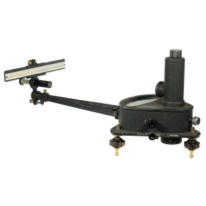 Das Gerät besteht aus zwei Teilen, dem Messwerk und einem Ausleger mit Skala und Zielfernrohr zur Ablesung der Skala. Das Drehspul-Messwerk sitzt in einem aufwendig und präzise gearbeitetes Gehäuse aus schwarz lackiertem Aluminiumguß. Der Sockel sitzt auf drei Füßen aus Messing, die jeweils in der Höhe verstellt werden können. Die Füße haben als Besonderheit nicht die üblichen Spitzen, sondern Kugeln. In der Mitte des Instruments findet sich an der Oberseite eine Libelle, diese hilft, das Gerät in der Horizontalen auszurichten. Das Messwerk hat eine Spannband-Aufhängung. Auf der Oberseite findet sich ein Hebel zur Arretierung des Messwerks, davor ein großer Drehknopf zur Justierung der Null-Stellung des Instruments. Neben dem Spiegel besitzt das Instrument auch noch einen Zeiger zur Ablesung des Messwerts. Die Skala im Gerät ist als Spiegelskala ausgeführt, die Teilung ist linear von 70 ... 0 ... 70. Am Ende des Auslegers sitzt eine zweite Skala mit einer lineare Teilung von 100 ... 0 ... 100. Diese Skala kann unabhängig über eine Messing-Schraube justiert werden. Unter der Skala sitzt das Zielfernrohr, über das die Skala sehr genau abgelesen werden kann. Das Zielfernrohr ist in der Neigung justierbar, zudem kann der Fokus durch Ziehen der hinteren Hülse eingestellt werden. Im Zielfernrohr sitzt ein Fadenkreuz, das über eine Rändelscheibe am hinteren Teil des Zielfernrohrs ausgerichtet werden kann. |
