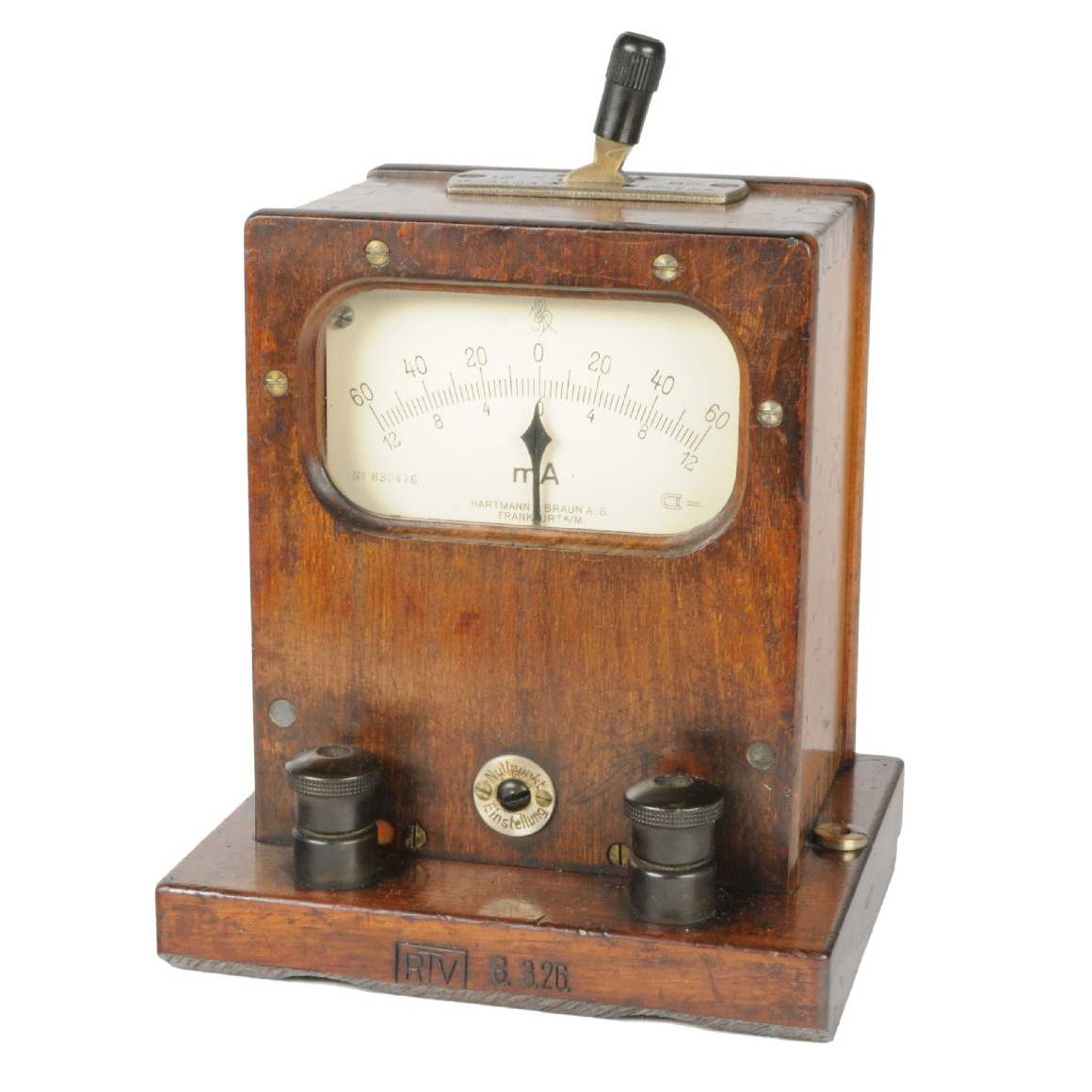 | Markierungen | Herstellername und Logo auf der Skala; Skalennummer 830416. Am Sockel ist zusätzlich die Inbetriebnahme vom "RTV 8.3.26" angegeben (Datum passt zur Skalennummer) |