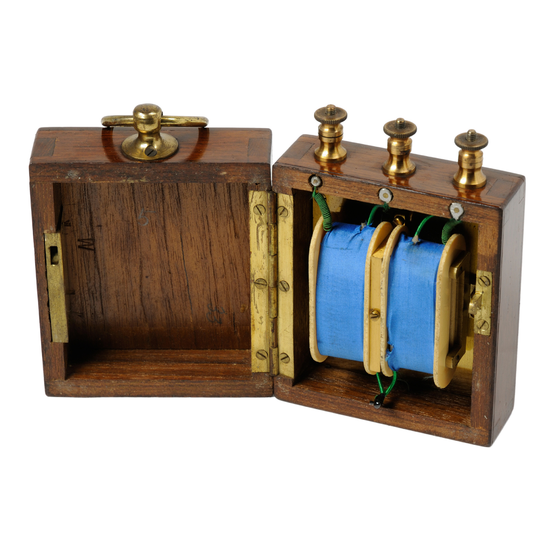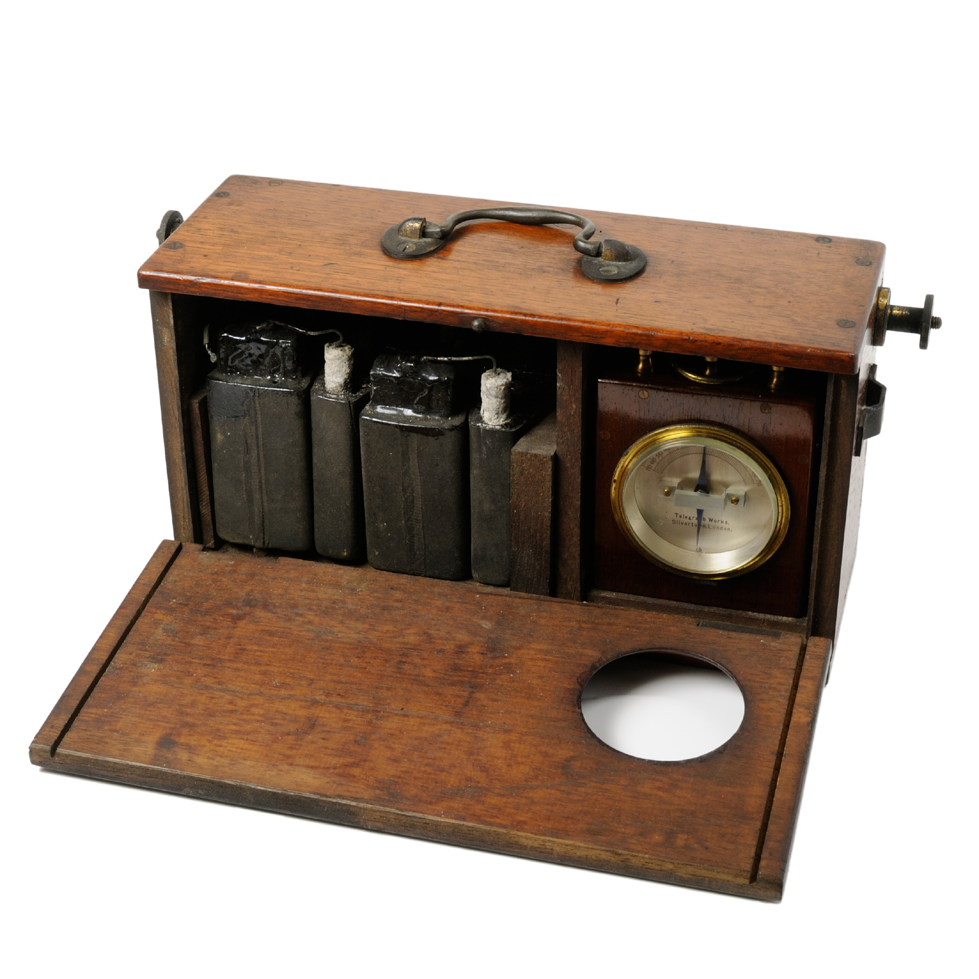 Das Test Set besteht aus einer Holz-Box (Mahagoni), das von vorne zu öffnen ist. In der Box finden sich zwei Fächer, im linken sind die Batterien untergebracht, in der rechten das Galvanometer. Durch eine Öffnung in der zu öffnenden Fronplatte ist die Skala des Galvanometers ablesbar. Der Batterie-Teil besteht aus vier dreieckigen Batterien, die mit Holzkeilen gesichert sind. Die Batterien sind mit dem Galvanometer in Serie geschaltet, die Anschlüsse sind nach außen geführt. Auf diese Weise kann ohne großen Aufwand das zu testende Kabel an den großen Klemmen außen an der Box angeschlossen werden. |