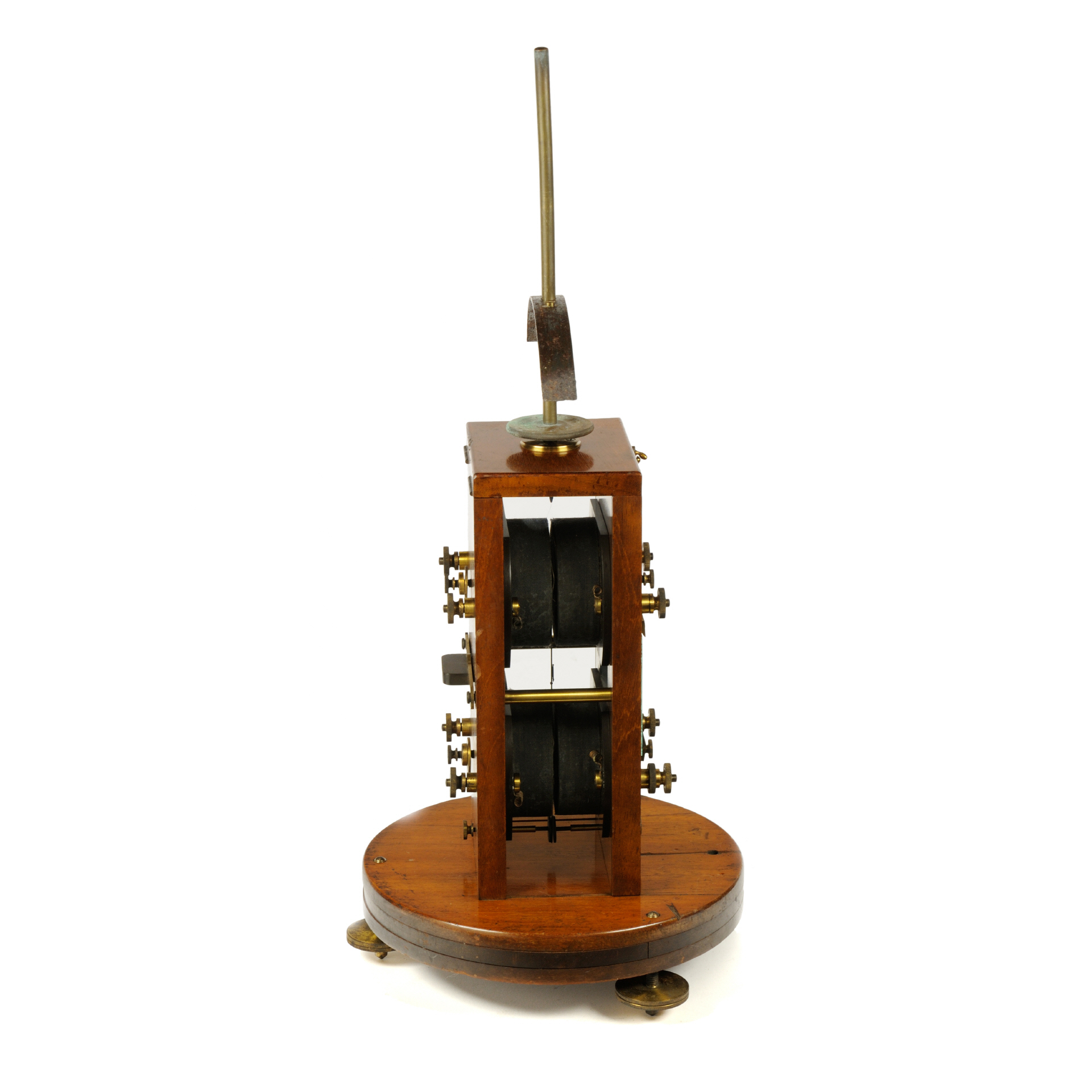 Das hier vorgestellte Instrument ist ein vierspuliges astatisches Galvanometer der Firma Keiser und Schmidt, konstruiert von H. du Bois und H. Rubens. Die Basis bildet eine Hartholzplatte (Mahagoni) auf drei Stellschrauben. Auf dieser Holzplate ist ein zweiteiliges Holzgehäuse, ebenfalls aus Mahagoni, montiert, dessen Vorderseite entfernbar ist. Auf einer in der Mitte des Deckels emporragenden kurzen Stift lässt sich eine längere vertikale Hülse schieben, auf der sich zwei Richtmagnete, ein größerer und ein kleinerer (dem Exponat fehlt einer der Magnete), drehbar hin und her bewegen lassen. Auf der Rückseite des Gehäuses befindet sich ein Verriegelungsbalken aus Messing. Durch drehen dieses Balkens wird die Verriegelung des Gehäuses gelöst und der gesamte Vorderteil (inklusive der daran befindlichen Spulen) kann gelöst werden. Das Messwerk, ein astatisches Thomsonsches Nadelsystem, ist dann zugänglich. Das Nadelsystem besteht oben und unten jeweils aus einem Magnetbündel, in der Mitte befindet sich der versilberte Planspiegel. Unten am System ist noch ein Flügel befestigt, welcher zur Dämpfung und Arretierung verwendet werden kann. Das Nadelsystem ist so konstruiert, dass es einfach entfernt werden kann. Die obere Halteschraube ist in einen horizontalen Messingbügel eingesteckt und kann durch mäßigen Druck herausgedrückt werden. Als Zubehör zu dem Gerät gab es auch noch ein Kästchen mit zusätzlichen Messwerken unterschiedlicher Empfindlichkeit. Jeweils auf der Innenseite der Front- und Rückwand sitzen die 4 Spulen, die von außen über Messingkontakte zugänglich sind. Die Seitenwände bestehen aus Glas, dadurch ist der Blick in das Innere des Geräts möglich. |