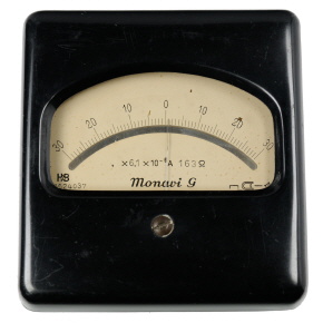 Das Monavi G Zeigergalvanometer besitzt ein empfindliches, in Spitzen gelagertes Drehspulmeßwerken und ist in erster Linie als Nullinstrumente für Brückenmessungen, Kompensationsschaltungen und ähnliches gedacht. Durch die besonders ausgebildete Skala von 60 Teilen (-30 ... 0 ... +30) kann das Gerät auch für empfindliche Messungen benutzt werden.