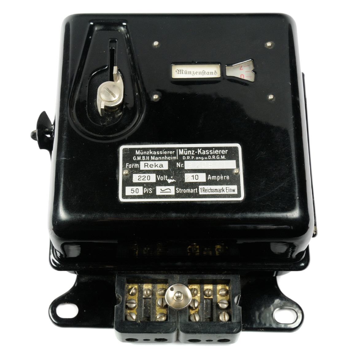Der Münzkassiererhat eine eingebautes, einfaches Uhrwerk, das durch den Münzeinwurf aufgezogen wird. Über zwei eingebaute Quecksilberschalter wird der Stromfluß durchgeschaltet, solange das Uhrwerk läuft. |