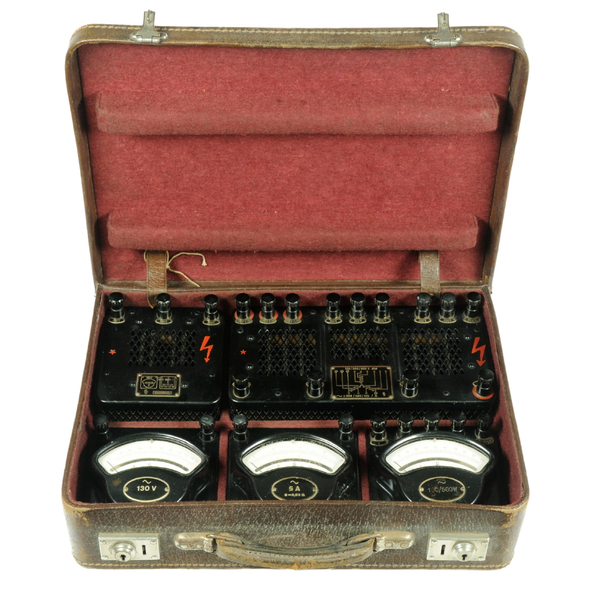| Lederkoffer mit Type-Z Messgeräten und Vor- und Nebenwiderständen zur Leistungsmessung in Wechselstromnetzen | |