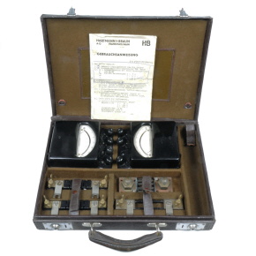 | Markierungen | Der Koffer selbst ist unbeschriftet. Die beiden enthaltenen Messgeräte haben die Seriennummern 2165655 (Amperemeter, 1942) und 2247109 (Voltmeter, 1943). Die beiliegende Bedienungsanleitung ist datiert vom 2.1.43 und trät das Zeichen "Gs./Ji.". |
