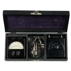 | Beschreibung | Kleines Mehrfachmeßgerät mit getrenntem Vorschaltgerät zur Widerstandsmessung, Anschlußkabeln und einiger Klemmen in einer Holzbox, innen mit violettem Samt ausgeschlagen. |